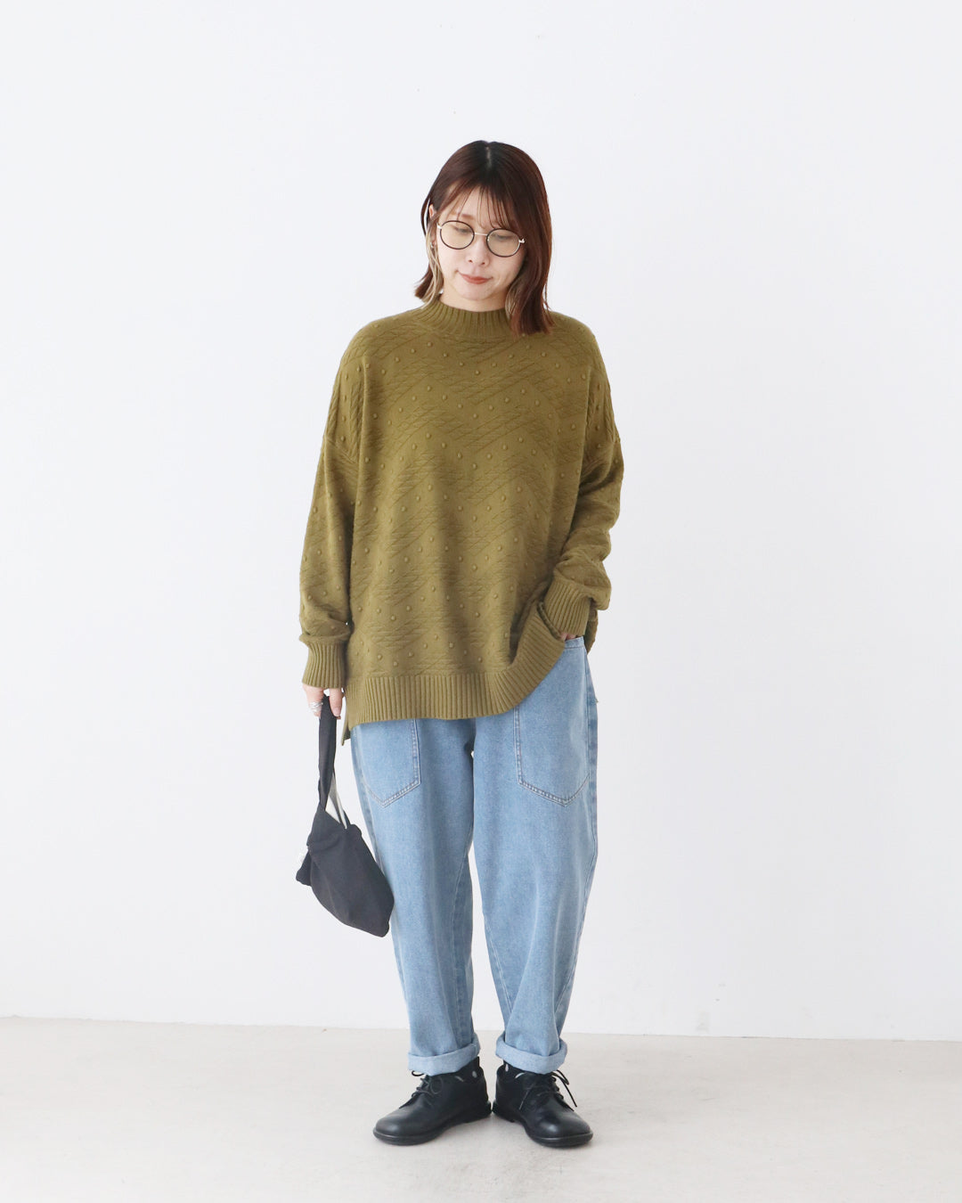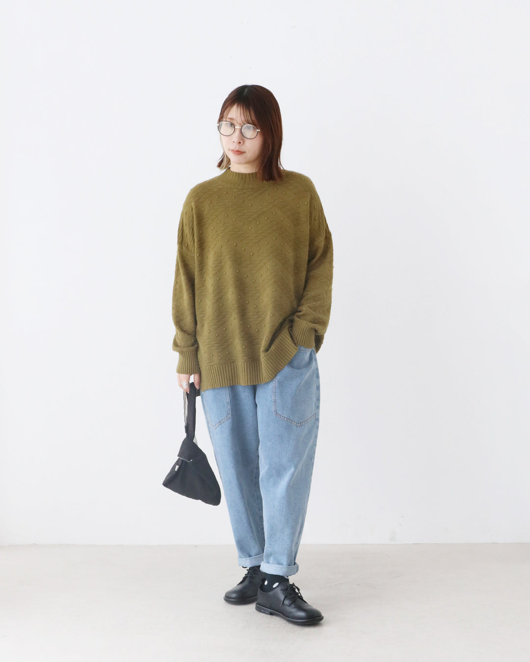 ポコポコとした表面感が可愛いカーキのニットに、ロールアップしたデニムを合わせた、こなれ感たっぷりのカジュアルスタイル。