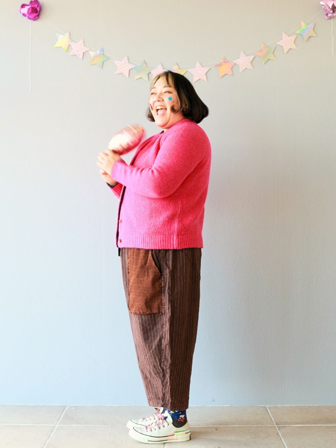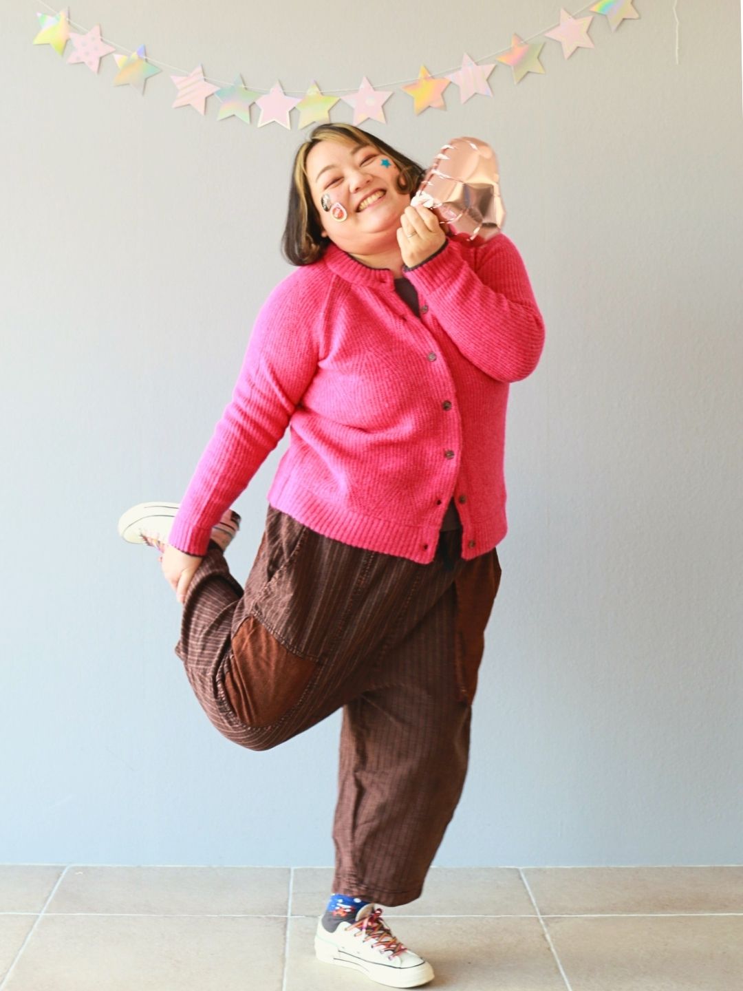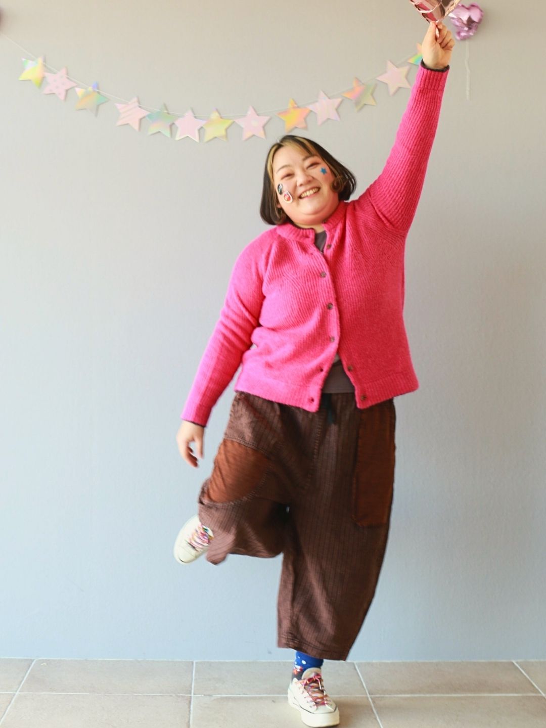 深みのあるビターなブラウンのパンツに、目が覚めるようなビビッドピンクのカーディガンを羽織った、甘酸っぱい「ベリー・ショコラ」コーデです。