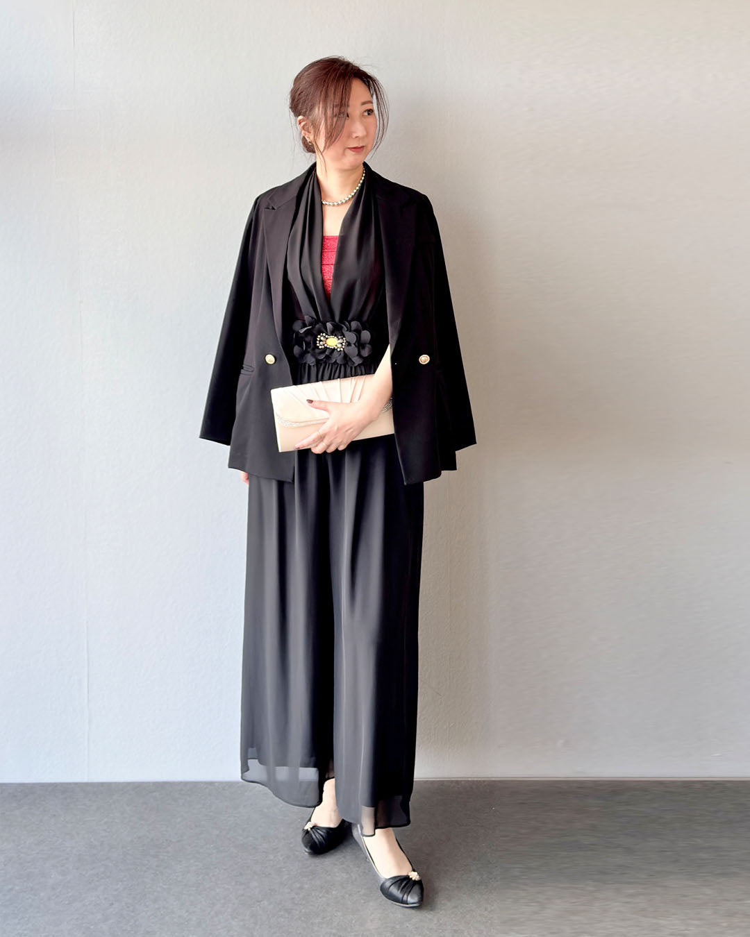 フォーマル用で買った黒のシフォンのオールインワンにさっとジャケットを羽織って。インナーに赤を効かせてややピリッとさせつつ、黒でシックにまとめました。華やかな場にもぴったりなコーデです。