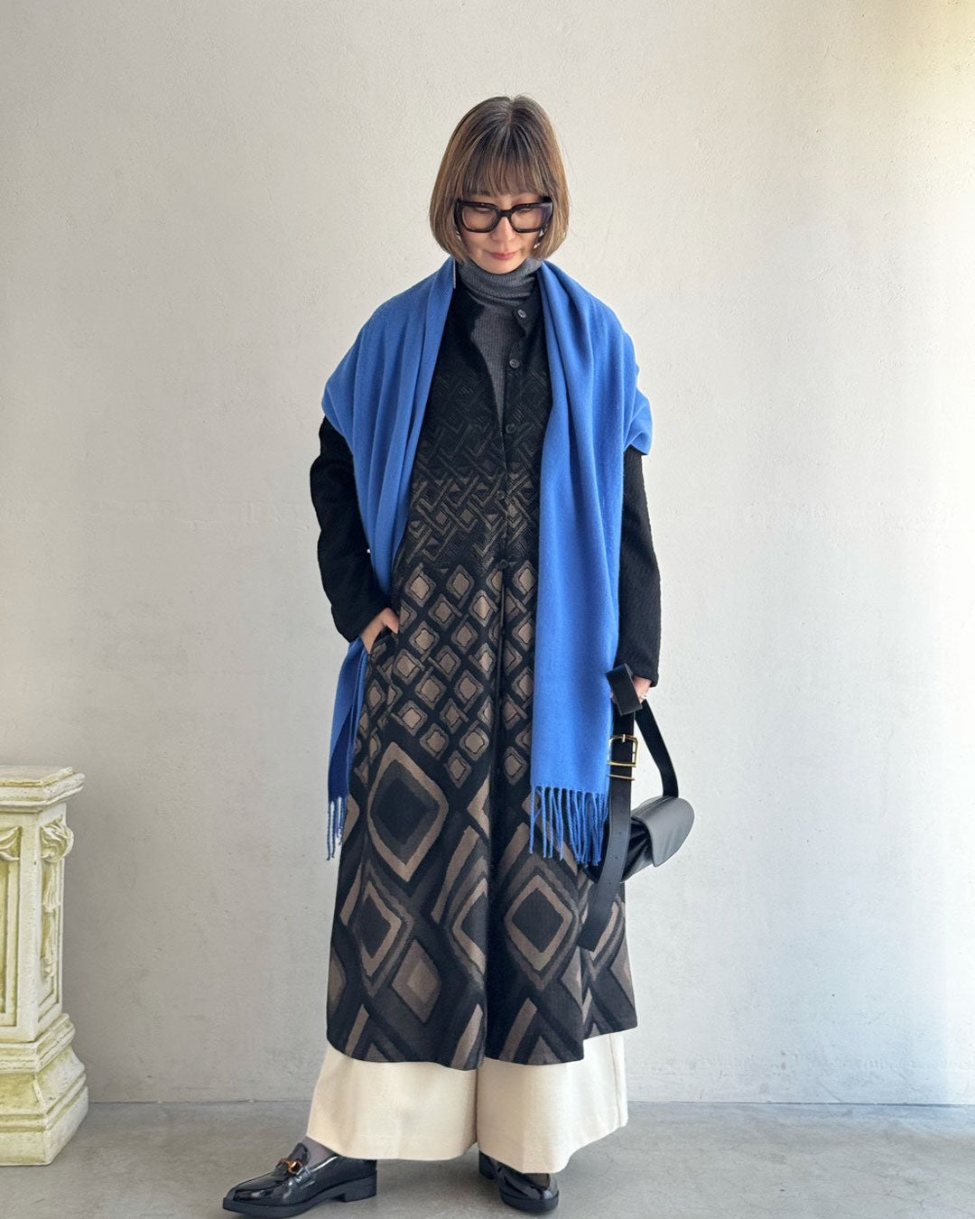 存在感のある柄羽織りはシンプルなコーデに羽織るだけで主役に。モノトーンの装いにブルーのストールを差し色に。考えすぎずおしゃれが決まる、そんな一枚です