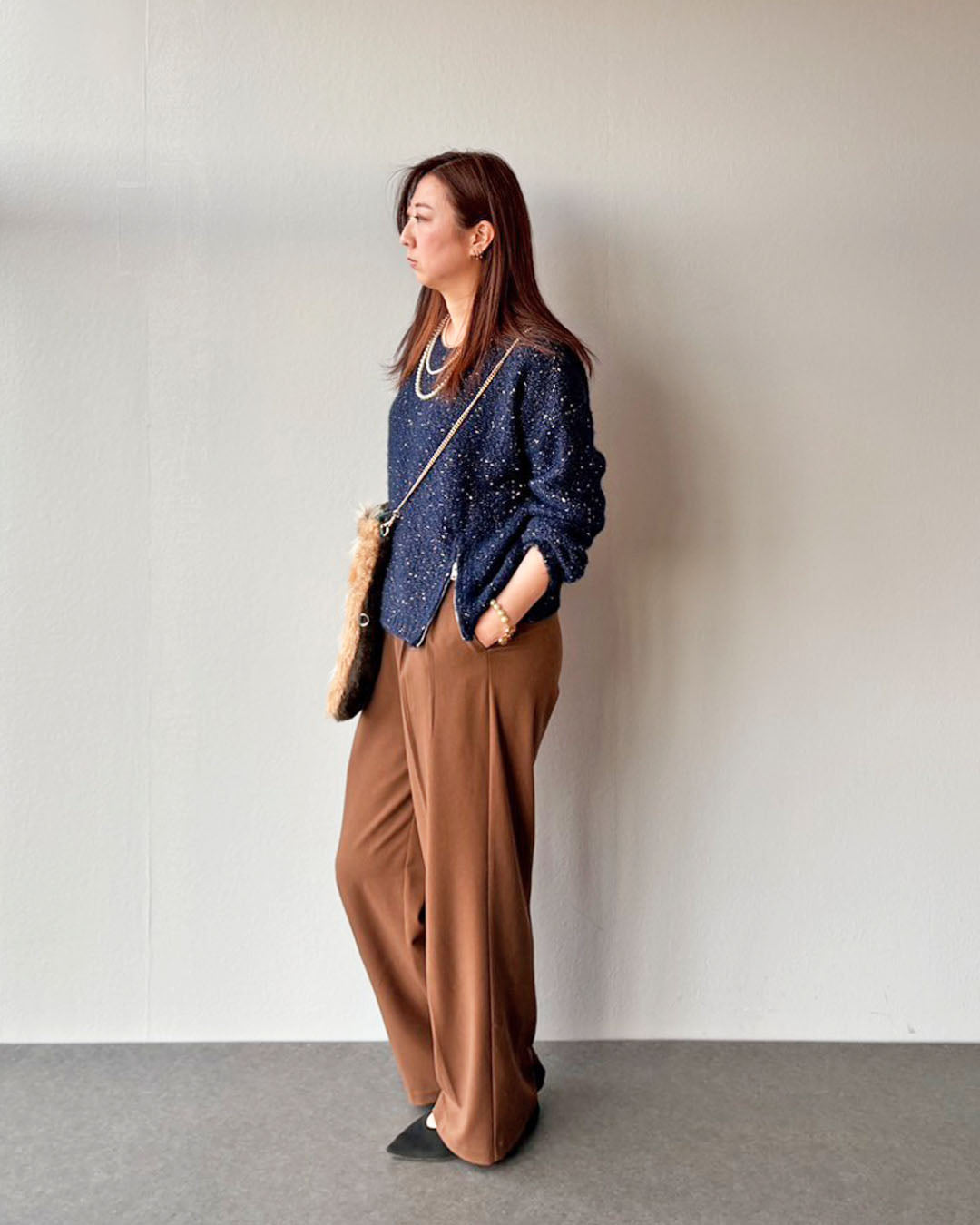 トレンドのブルー×ブラウンで今っぽコーデに。カジュアルになりすぎないラメ糸で編まれたざっくりニットにブラウンのタックパンツで綺麗め大人コーデに仕上げました。