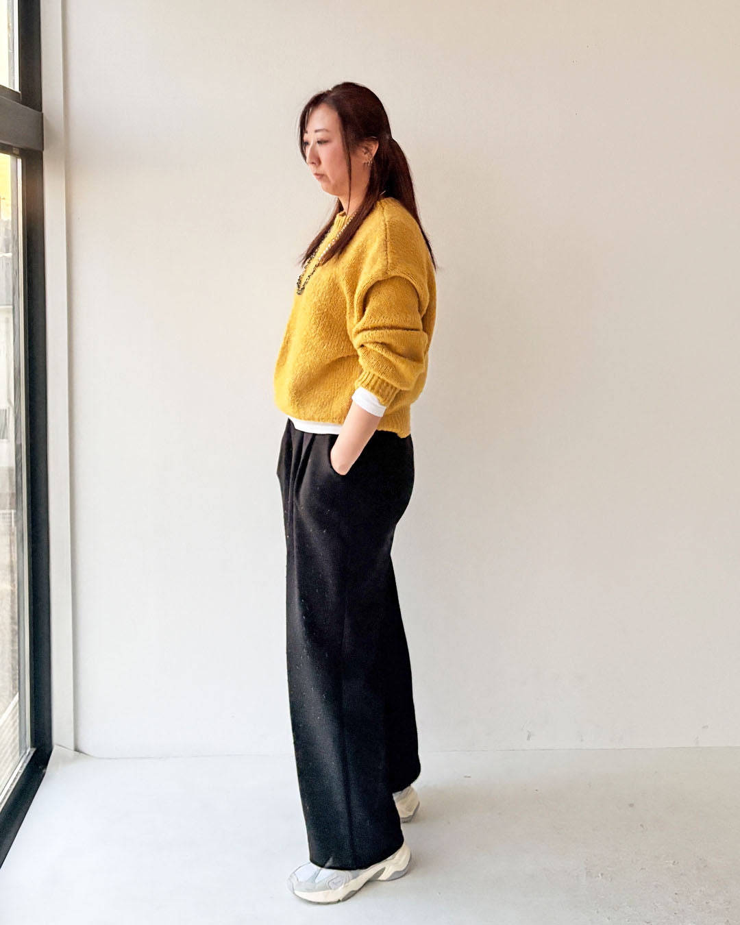 ニットとスウェットパンツは失敗するとただの部屋着になりがち。なんか違うな?を回避するためにインナーの白を裾と手首からチラ見せしました。スウェットパンツはビジューをあしらった綺麗めの拘りパンツで脱部屋着に気を付けた楽ちんワンマイルコーデです。