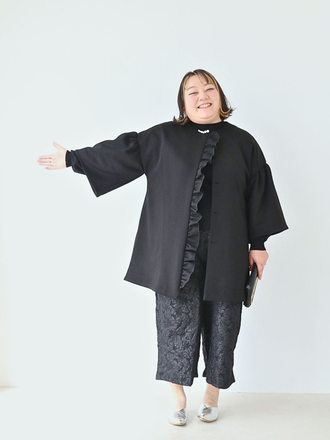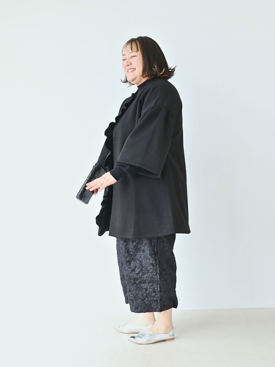 全体はゆったりシルエットで、体型カバーしながらもすっきり見えるバランスを意識しています。