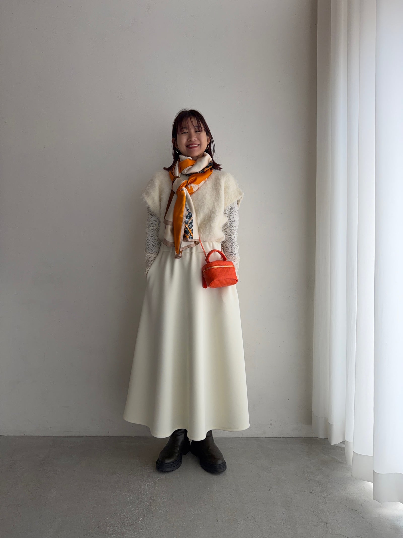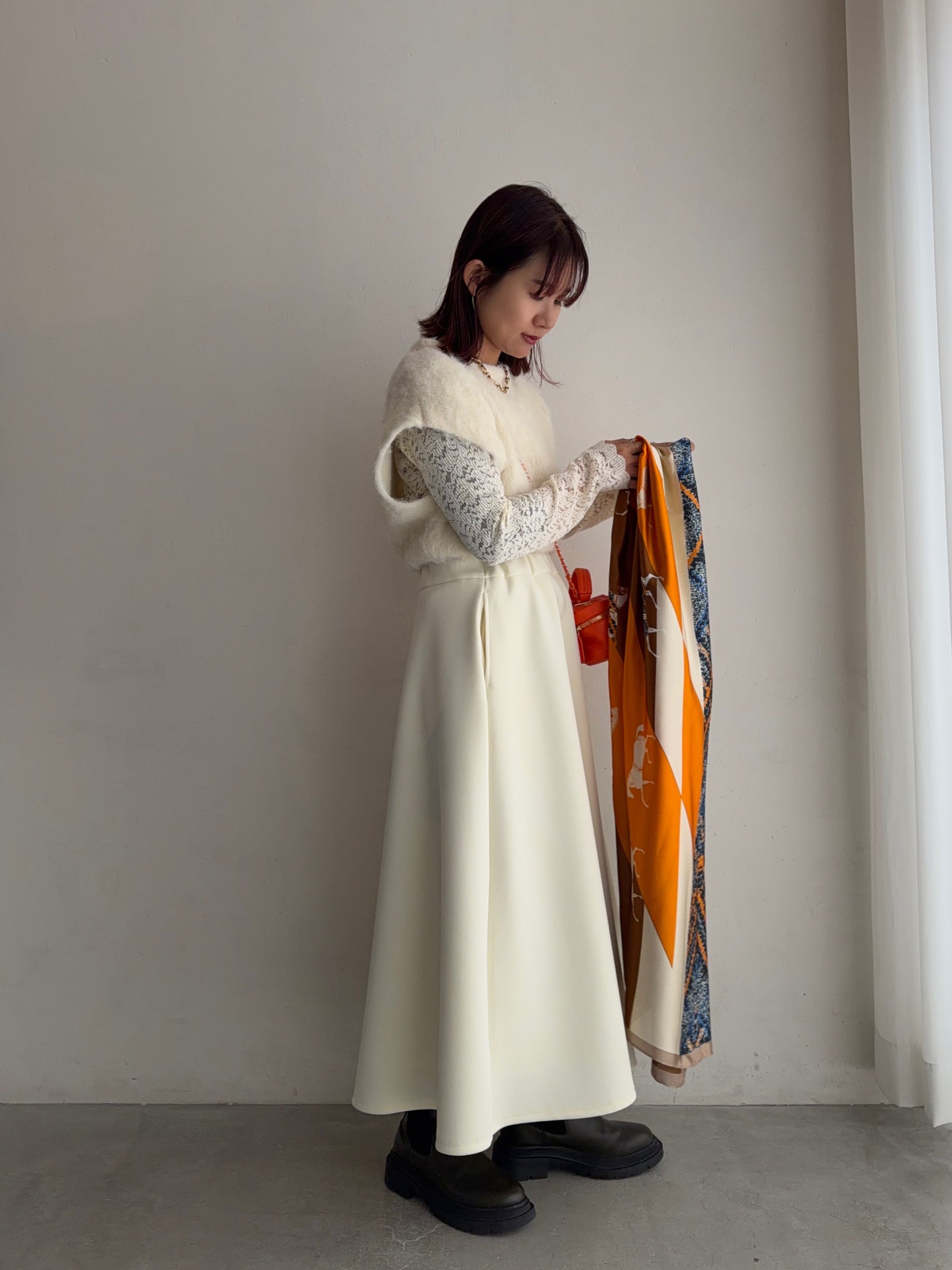 柔らかなエクリュトーンにビビッドなオレンジを差して季節を先取りしたスタイル。