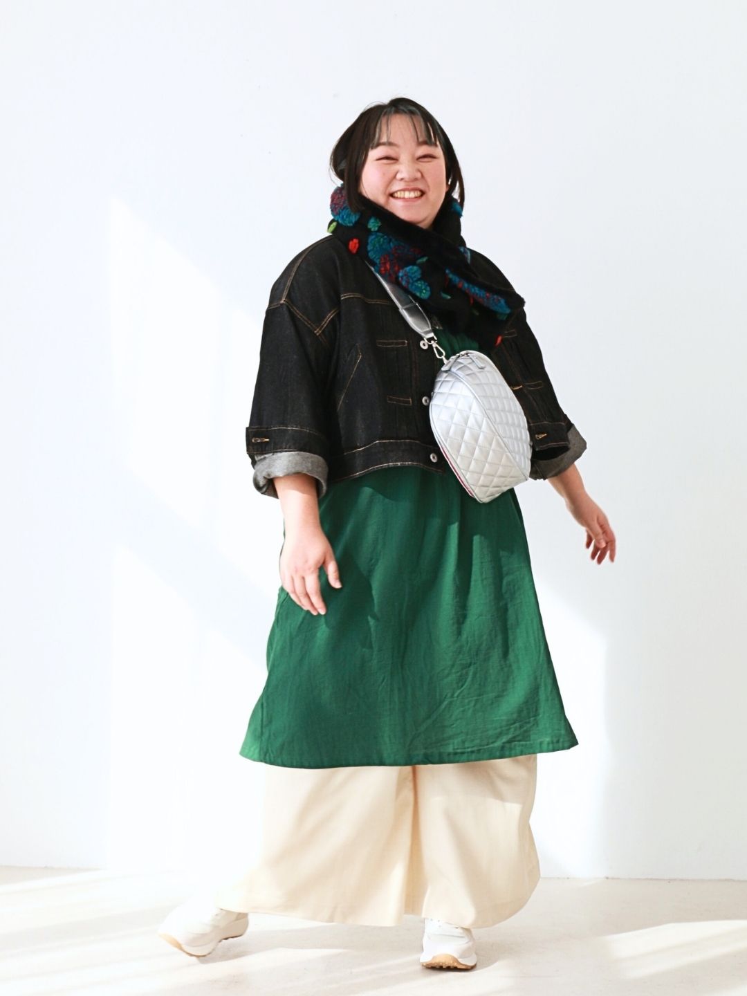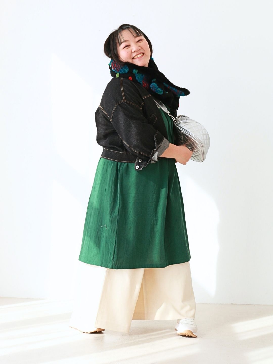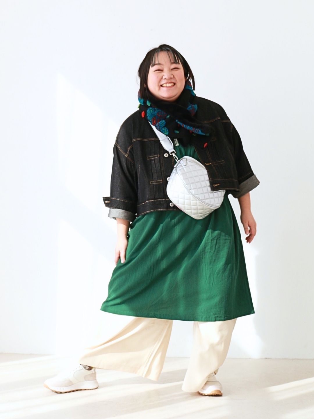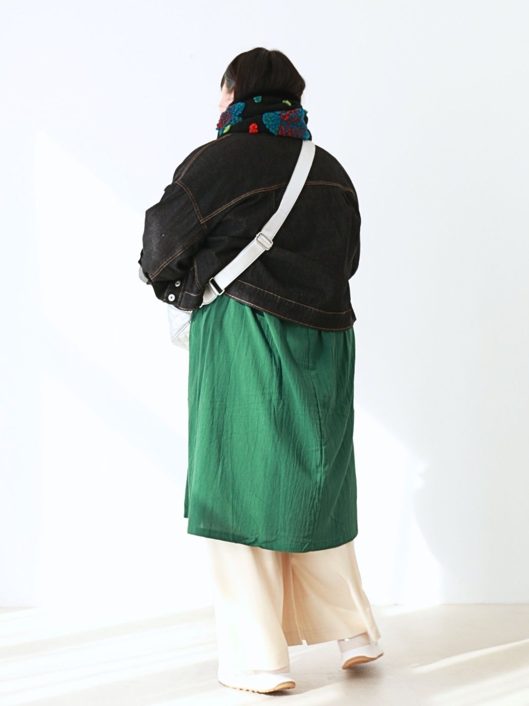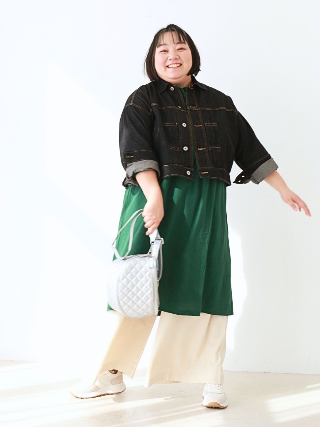 グリーン×アイボリーの爽やか配色に、ショート丈デニムジャケットでスタイルアップも叶う一着。