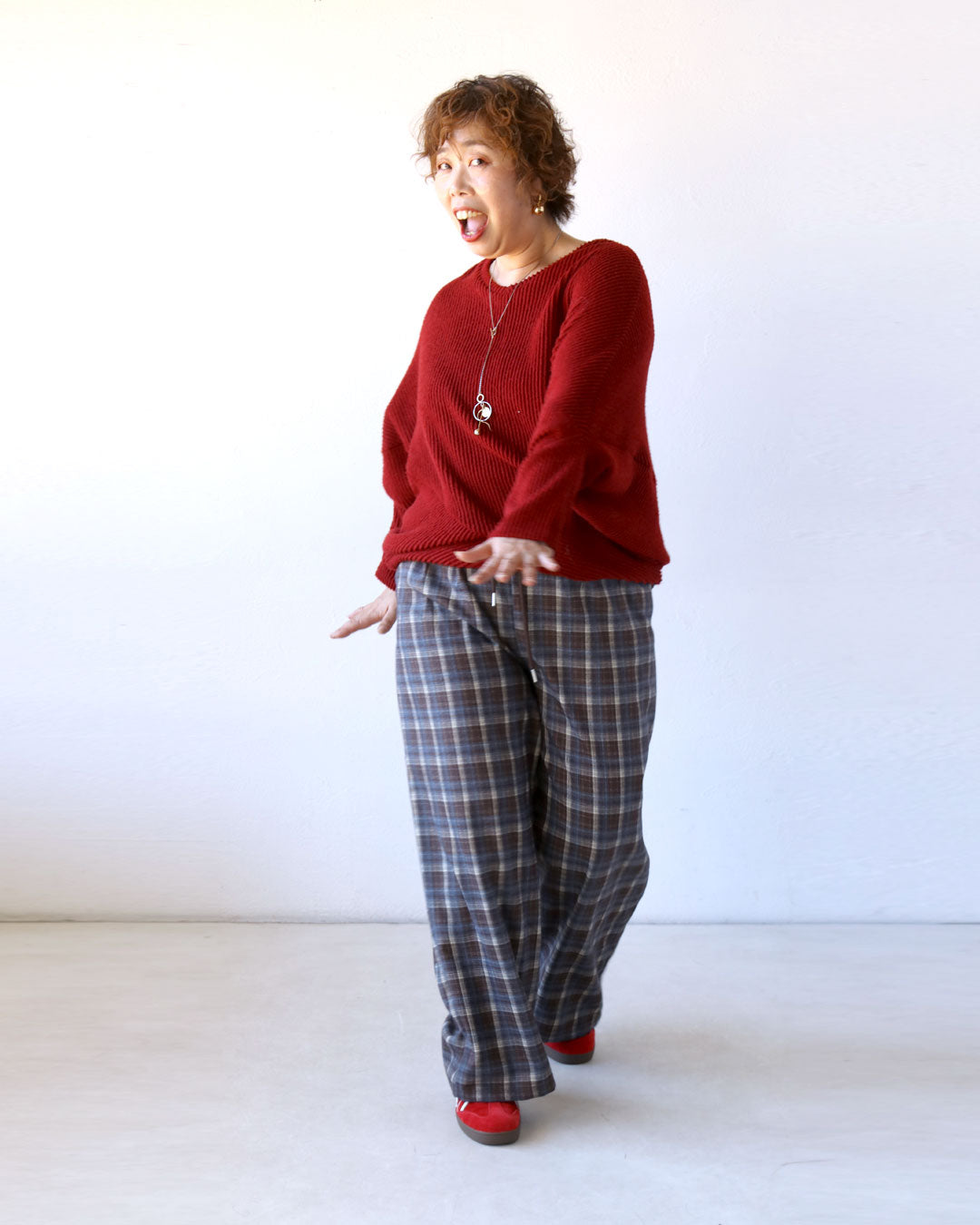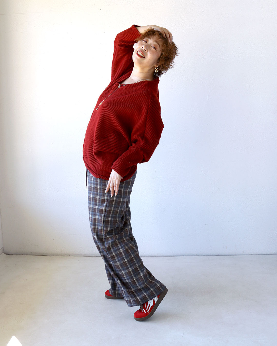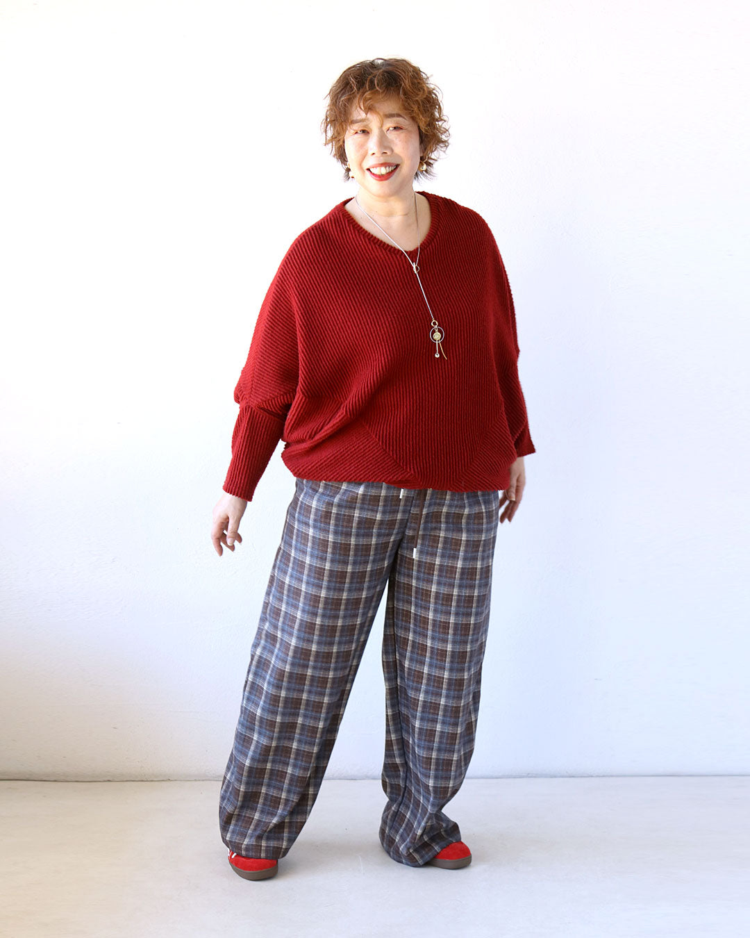 派手過ぎない赤で着映え効果のある変形ドルマンニットは、ゆとりがあり、やわらかな着心地♪ほどよい個性と女性らしい印象も♪