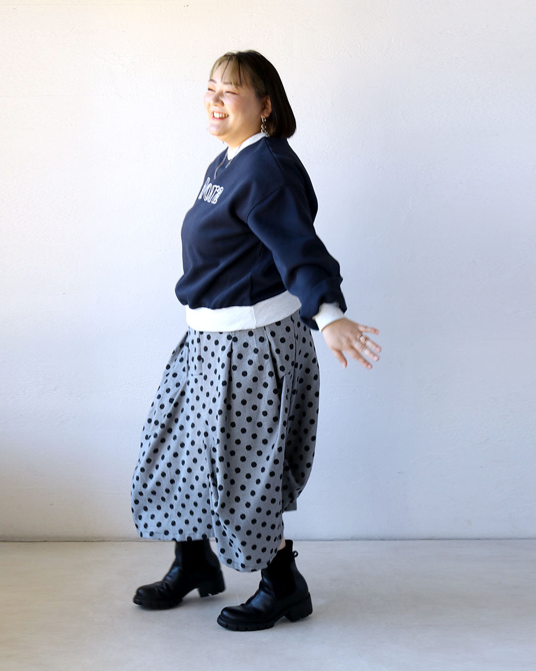 トップスのネイビーが全体を引き締め、ドット柄スカートの可愛さをほどよく大人寄りに調整。甘くなりすぎず、40代・50代にも取り入れやすい頑張りすぎないのにおしゃれなコーデが完成♪トップスは1/31新作販売予定です✨