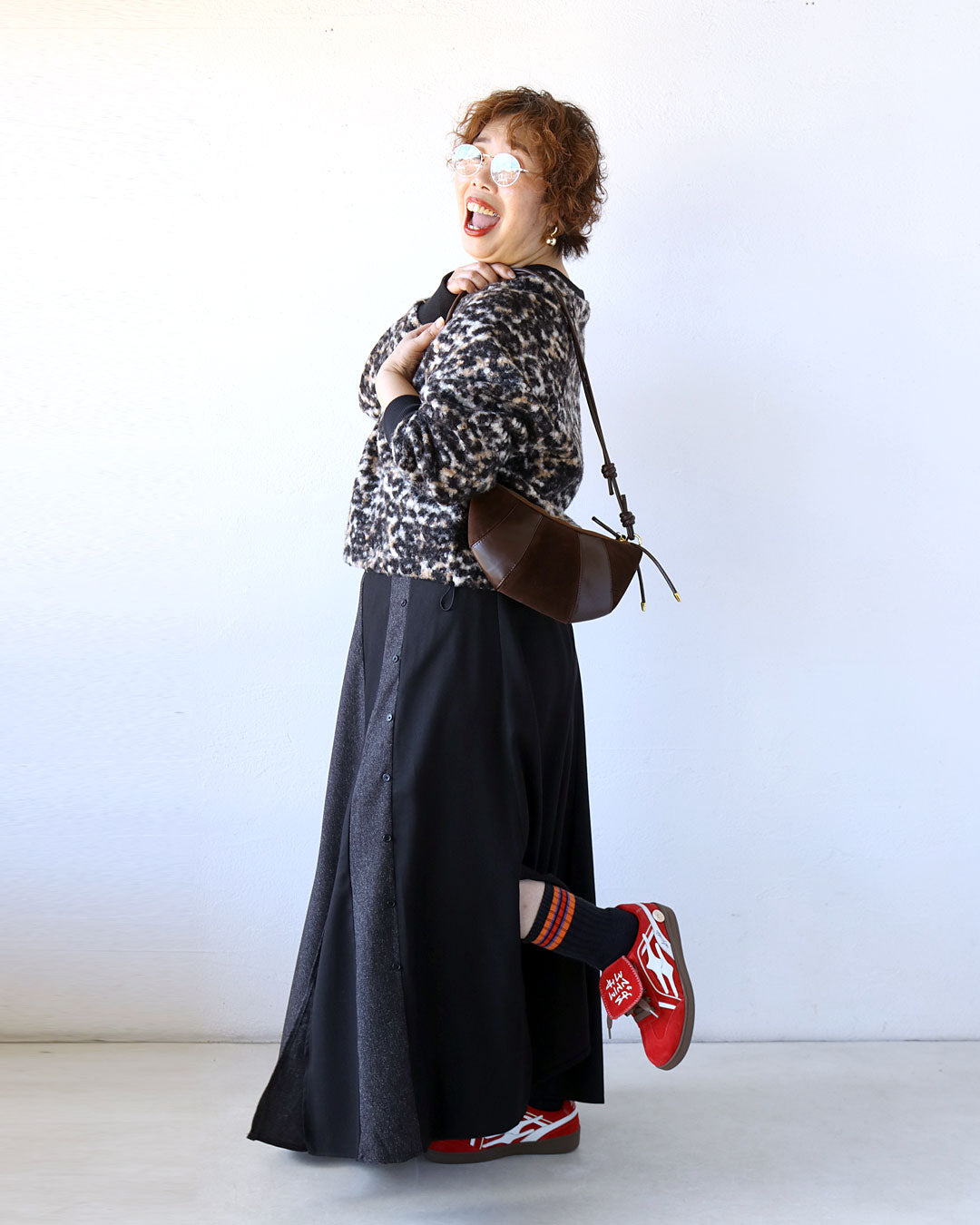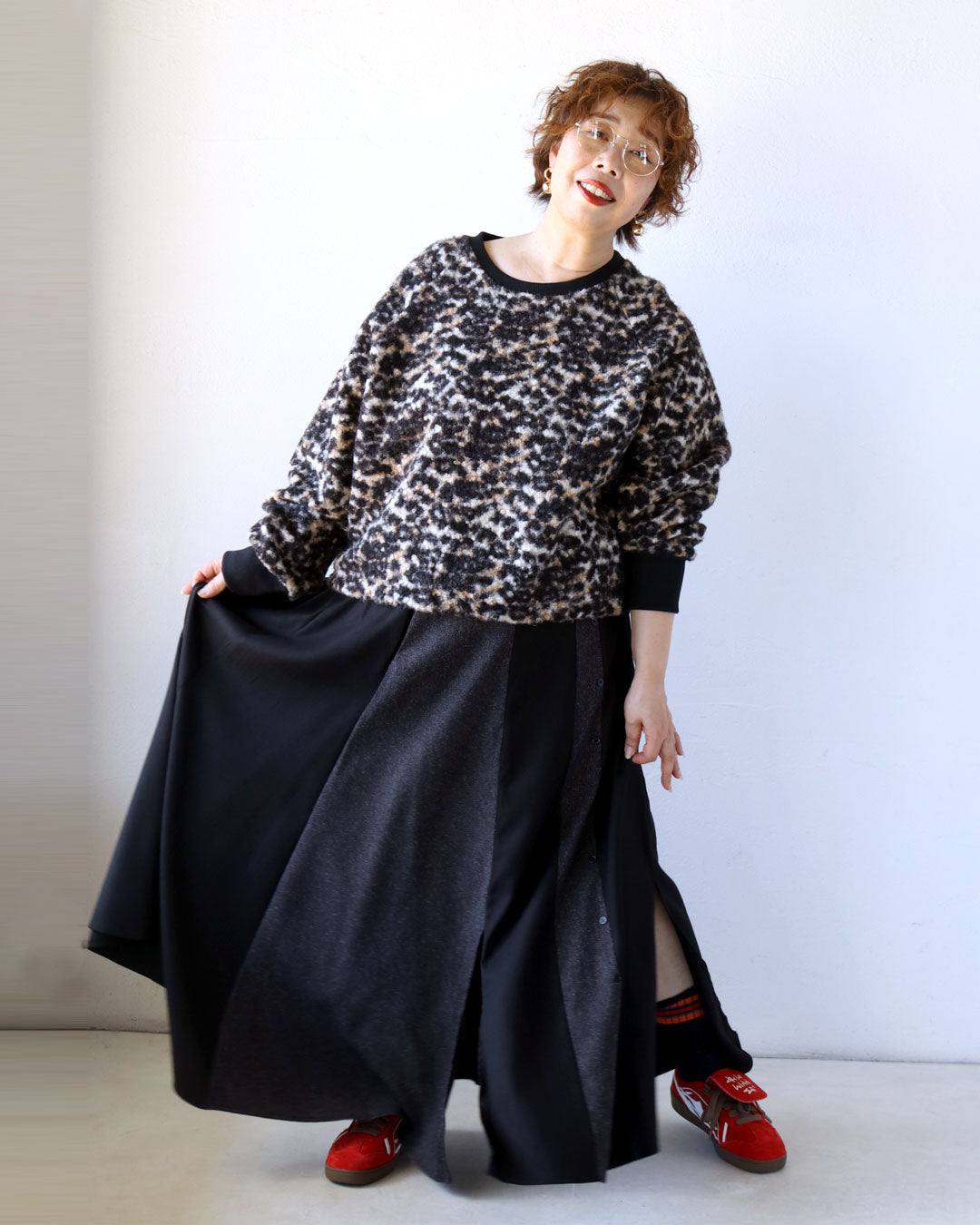 存在感のある柄トップスも、ボトムスをシックなブラック系でまとめることで、大人にちょうどいい華やかさに。スニーカー合わせで“外し”を効かせて大人の余裕と遊び心を感じさせる「ラクなのにおしゃれ」「個性が活きる」そんな理想を叶える着こなしです♪