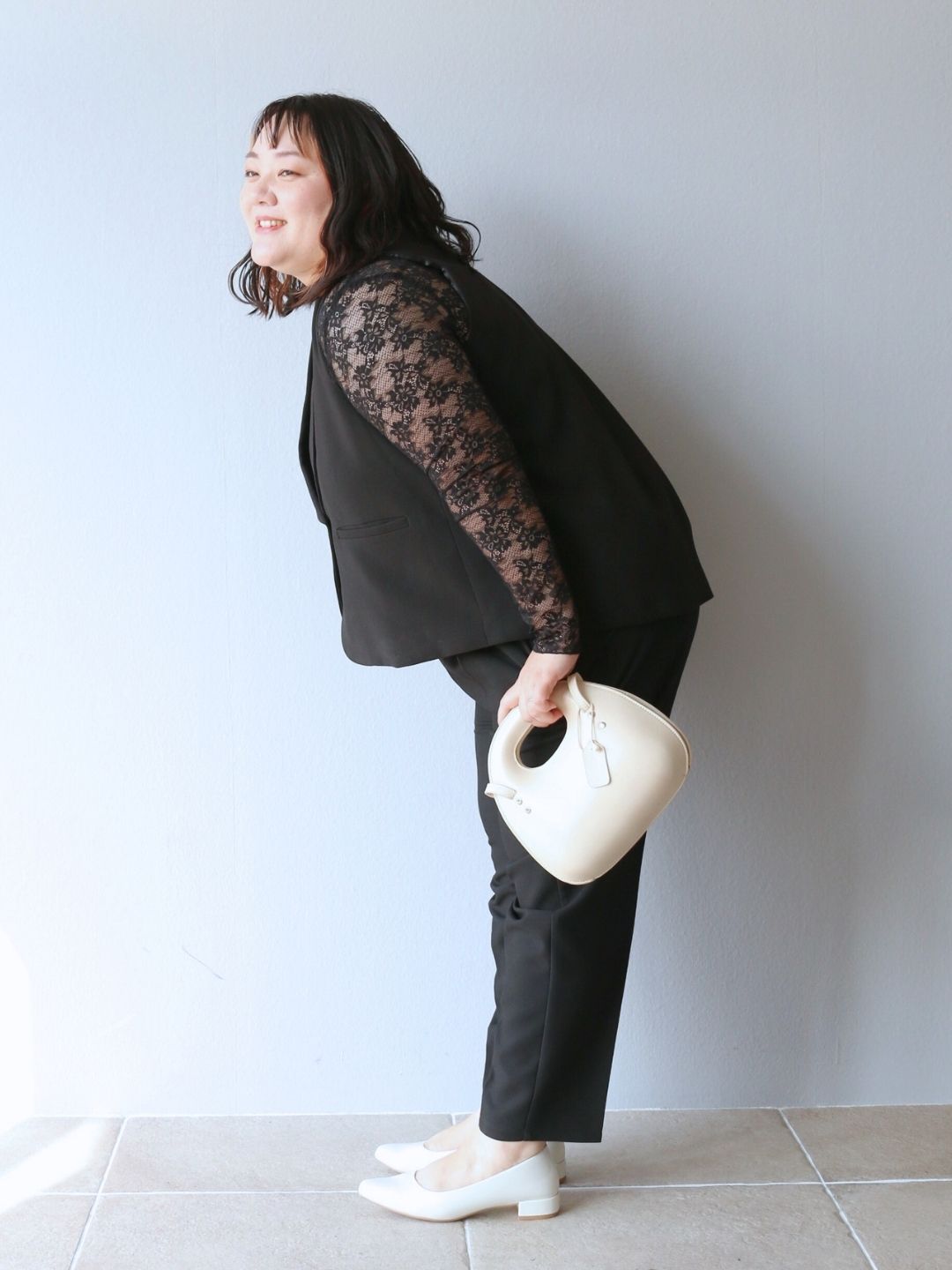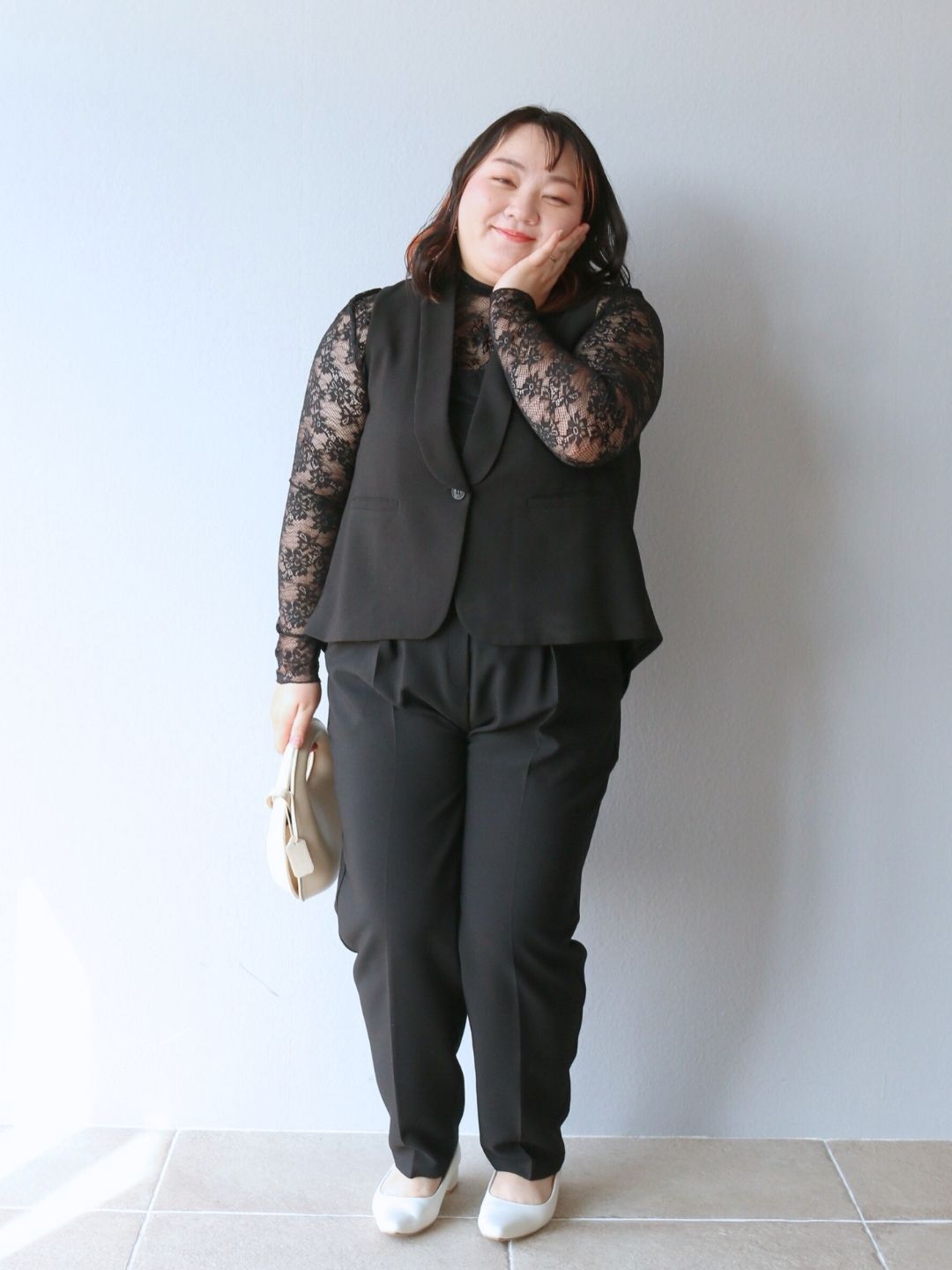 ふんわりレースのインナー×タキシード風ベスト&テーパードパンツのモノトーンセットが、“ぽっちゃりでもシルエット美”を叶え、きちんと感と自分らしさを両立させたフォーマルスタイルです。