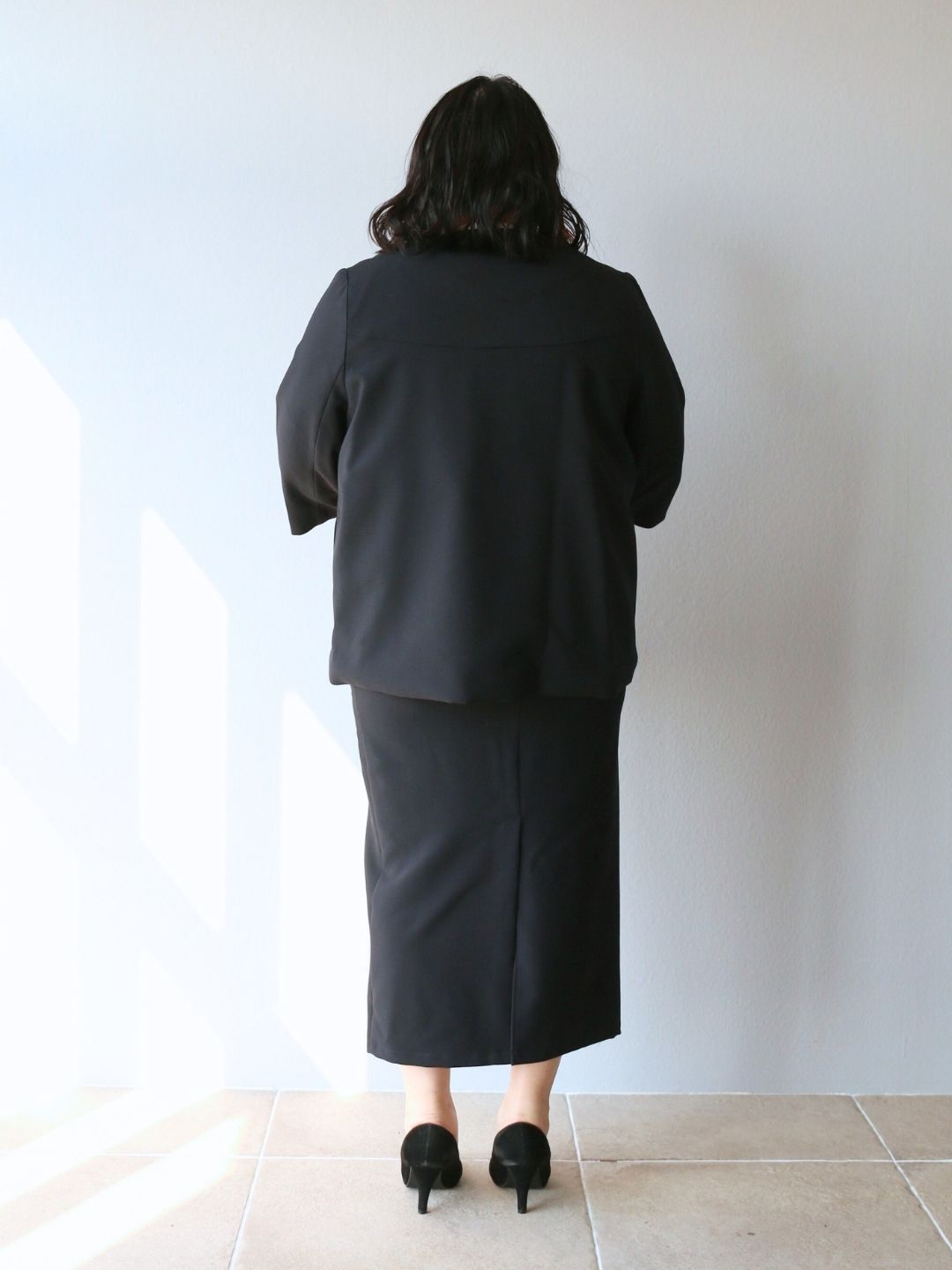 きちんと感と華やかさを両立するスカートセットアップ。Iラインと長め丈でスッキリ見え、腕まわりも自然にカバー。節目のセレモニーに、整う1着です。