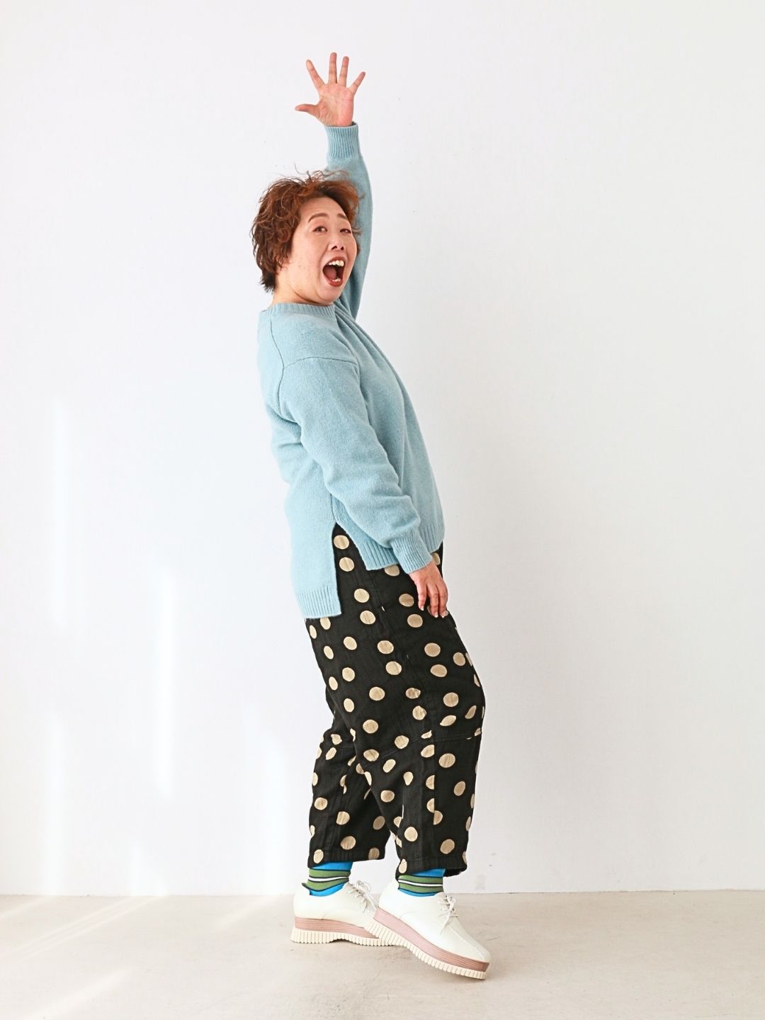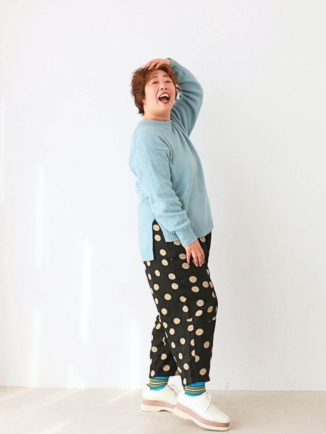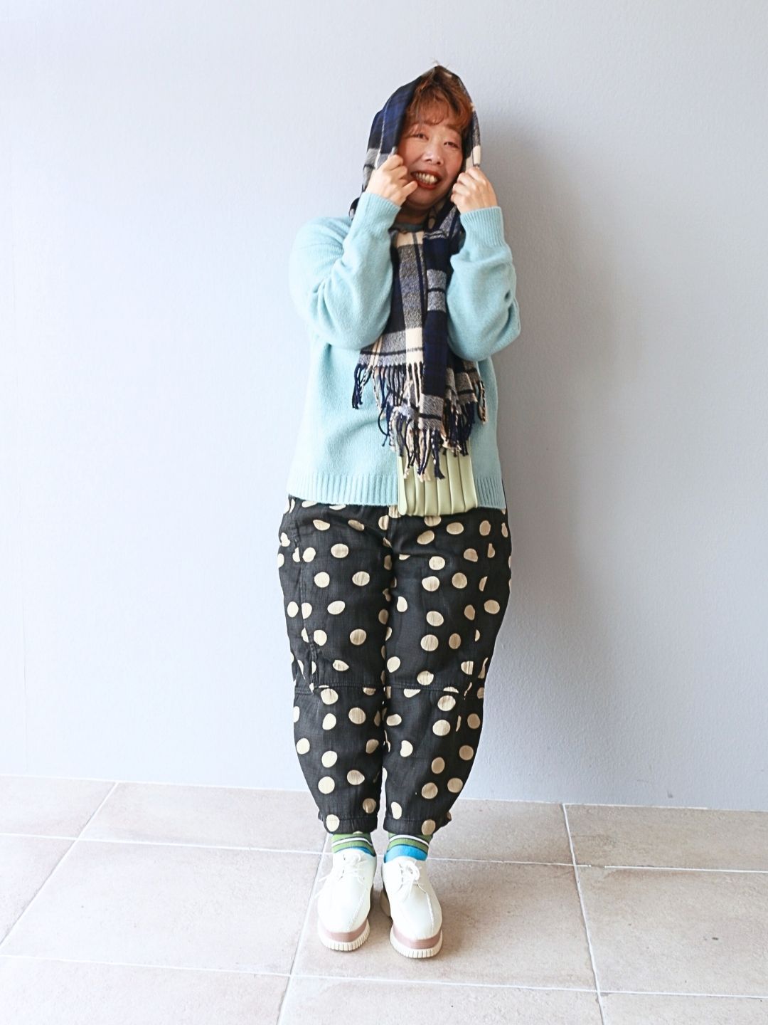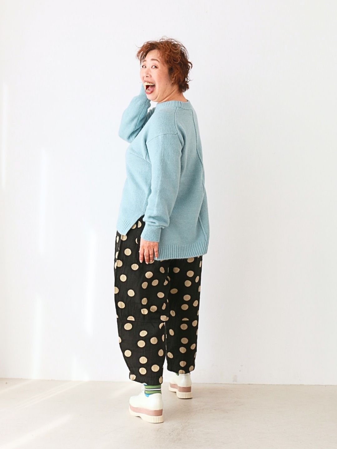柔らかなライトブルーのニットに、遊び心あるドットパンツを合わせたごきげん初詣コーデ。ゆったりシルエットでも、ふんわり色合わせが顔まわりを明るく見せてくれるのがポイント。参拝やお出かけにも動きやすく、気負わず“私らしさ”を楽しめるスタイルです。