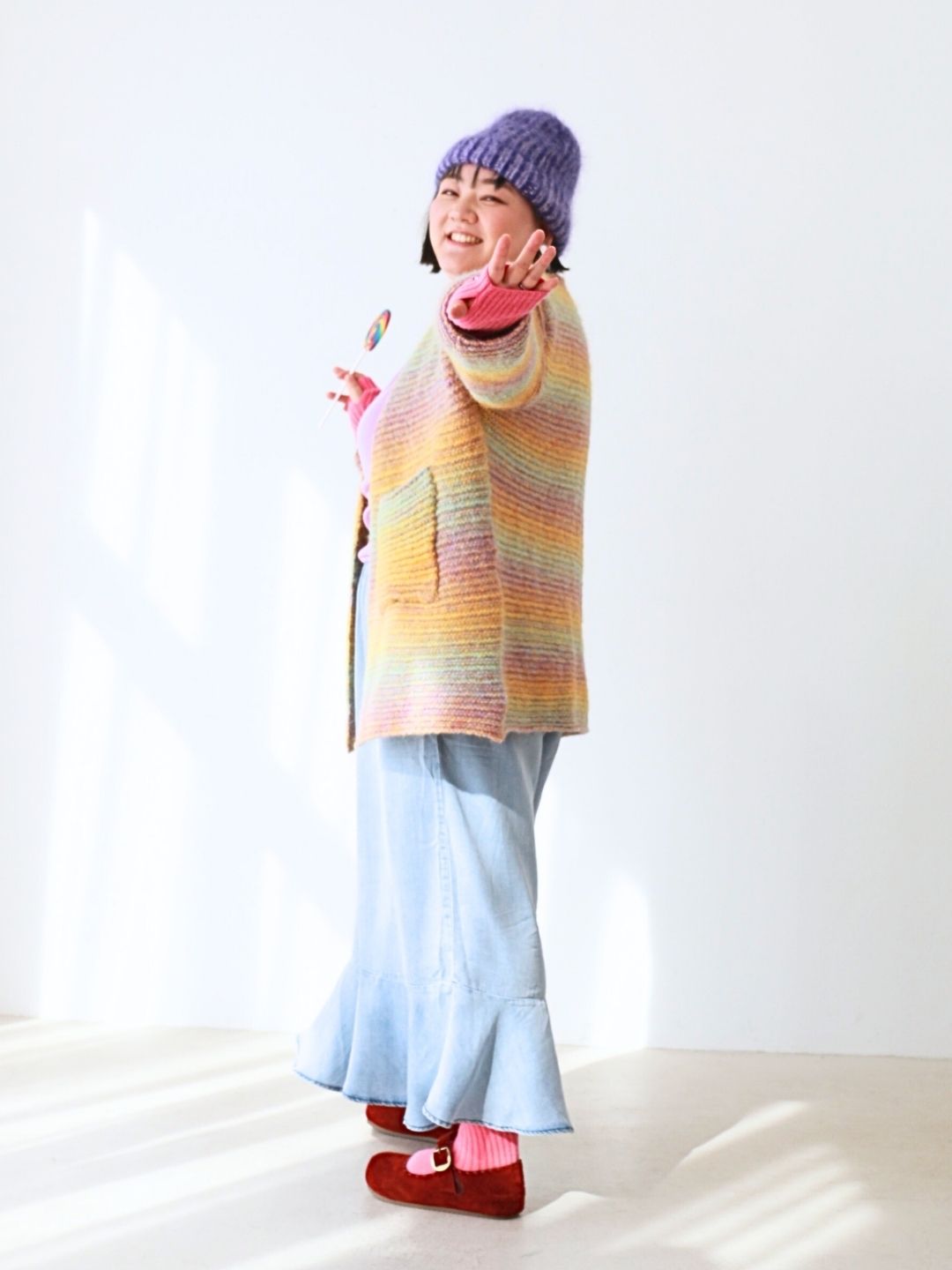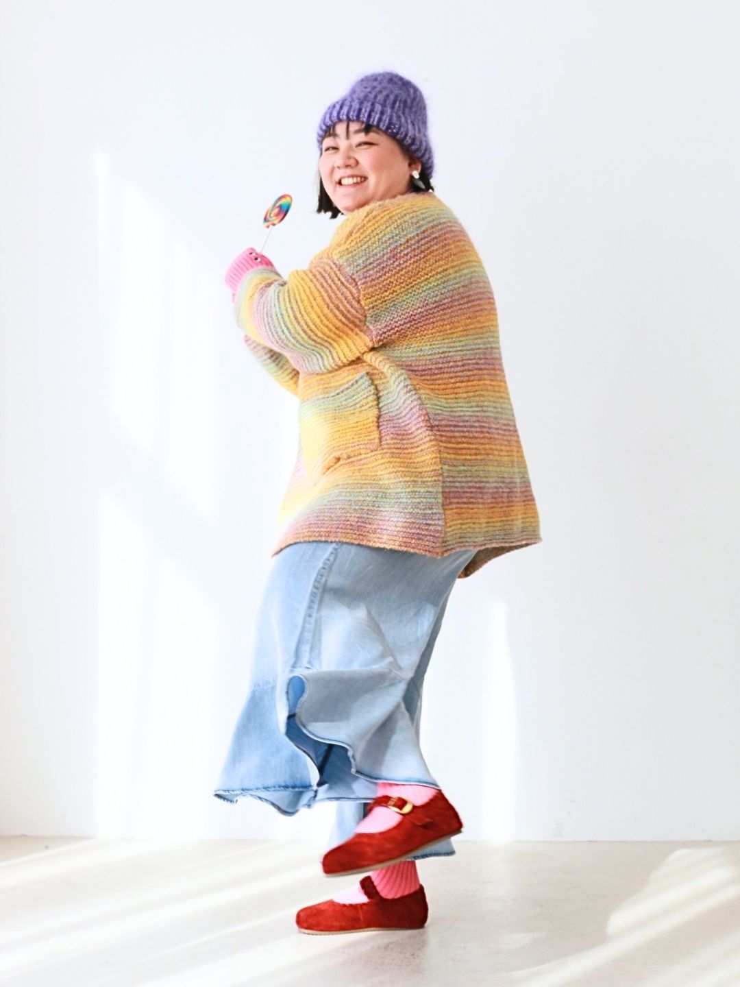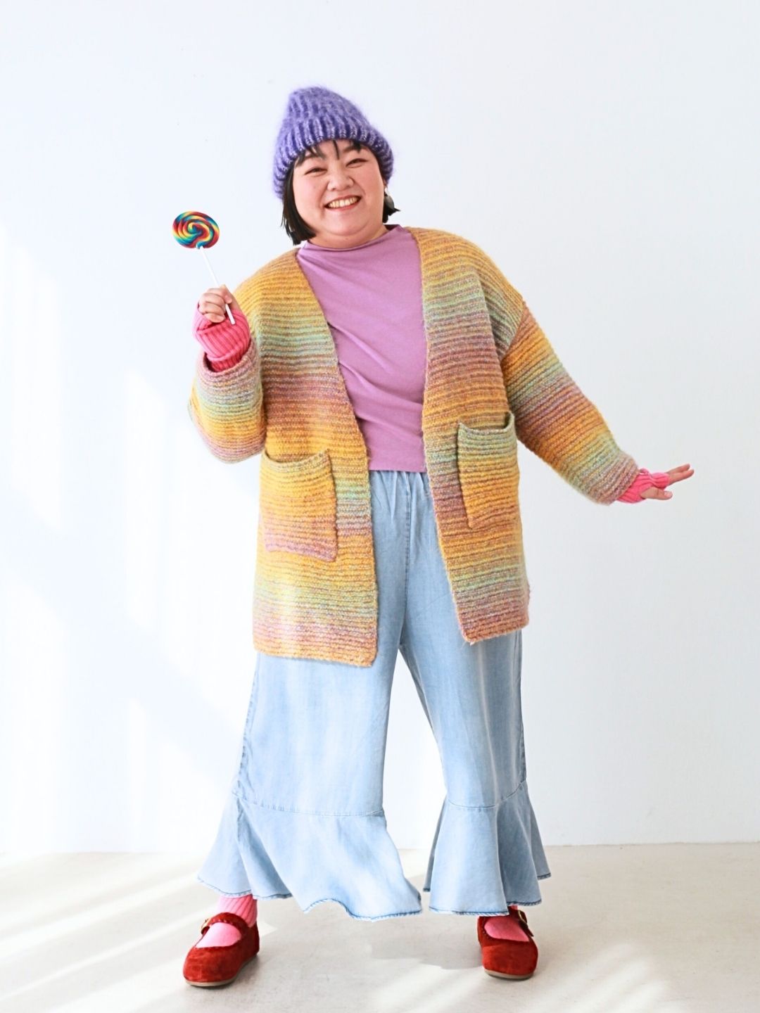 カラフルな虹色ニットと、ふんわり軽やかデニムパンツの組み合わせで、おうち時間も思いきり“わたし色”に。リラックス感たっぷりのシルエットで動きやすく、着心地もバツグン!ふわもこのニット帽やカラフルソックスを添えて、ぽっちゃりさんの可愛さと遊び心がつまったお正月コーデに仕上げました。