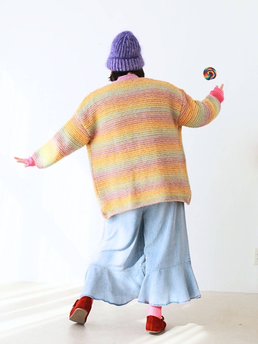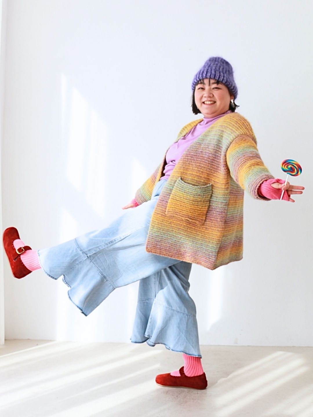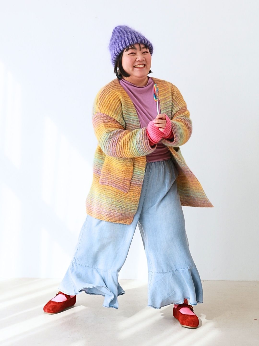 カラフルな虹色ニットと、ふんわり軽やかデニムパンツの組み合わせで、おうち時間も思いきり“わたし色”に。リラックス感たっぷりのシルエットで動きやすく、着心地もバツグン!ふわもこのニット帽やカラフルソックスを添えて、ぽっちゃりさんの可愛さと遊び心がつまったお正月コーデに仕上げました。