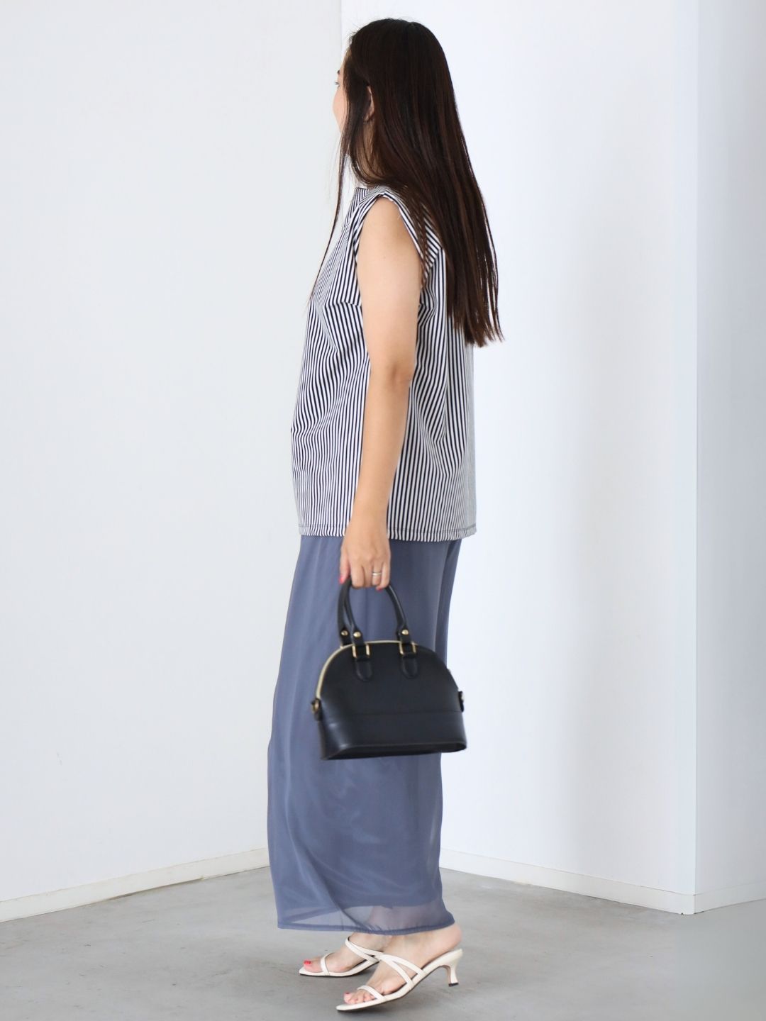ネイビーのストライプトップスに、軽やかなシフォンパンツを合わせました。