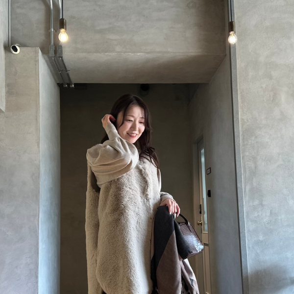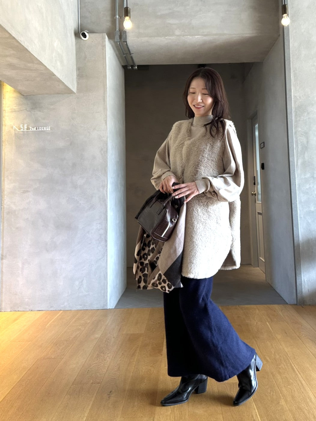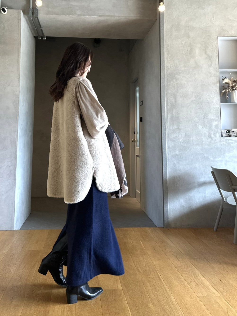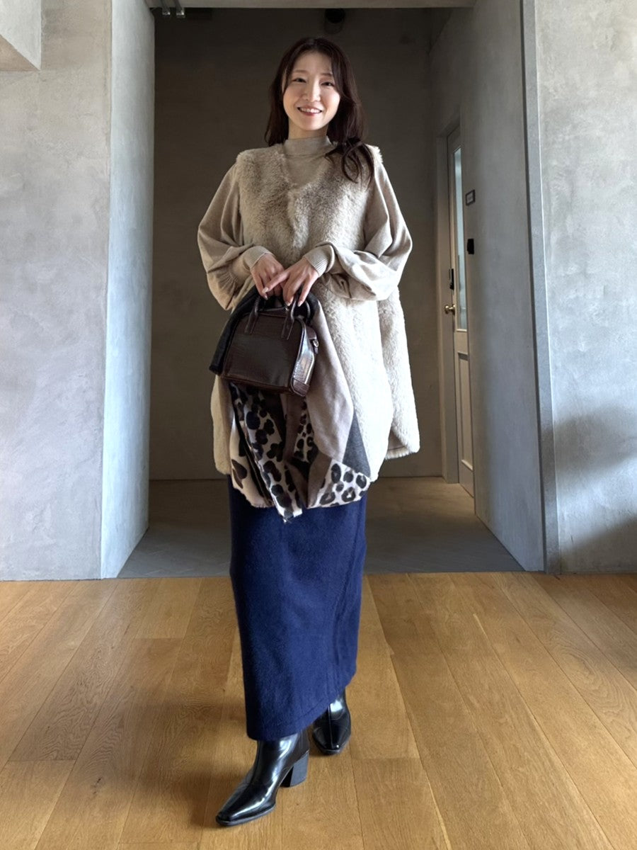 すっきりしたスカートにボリュームのあるファーベストを合わせて上品な雰囲気に。ネイビー×ベージュの組み合わせが可愛くて、気に入っています♪