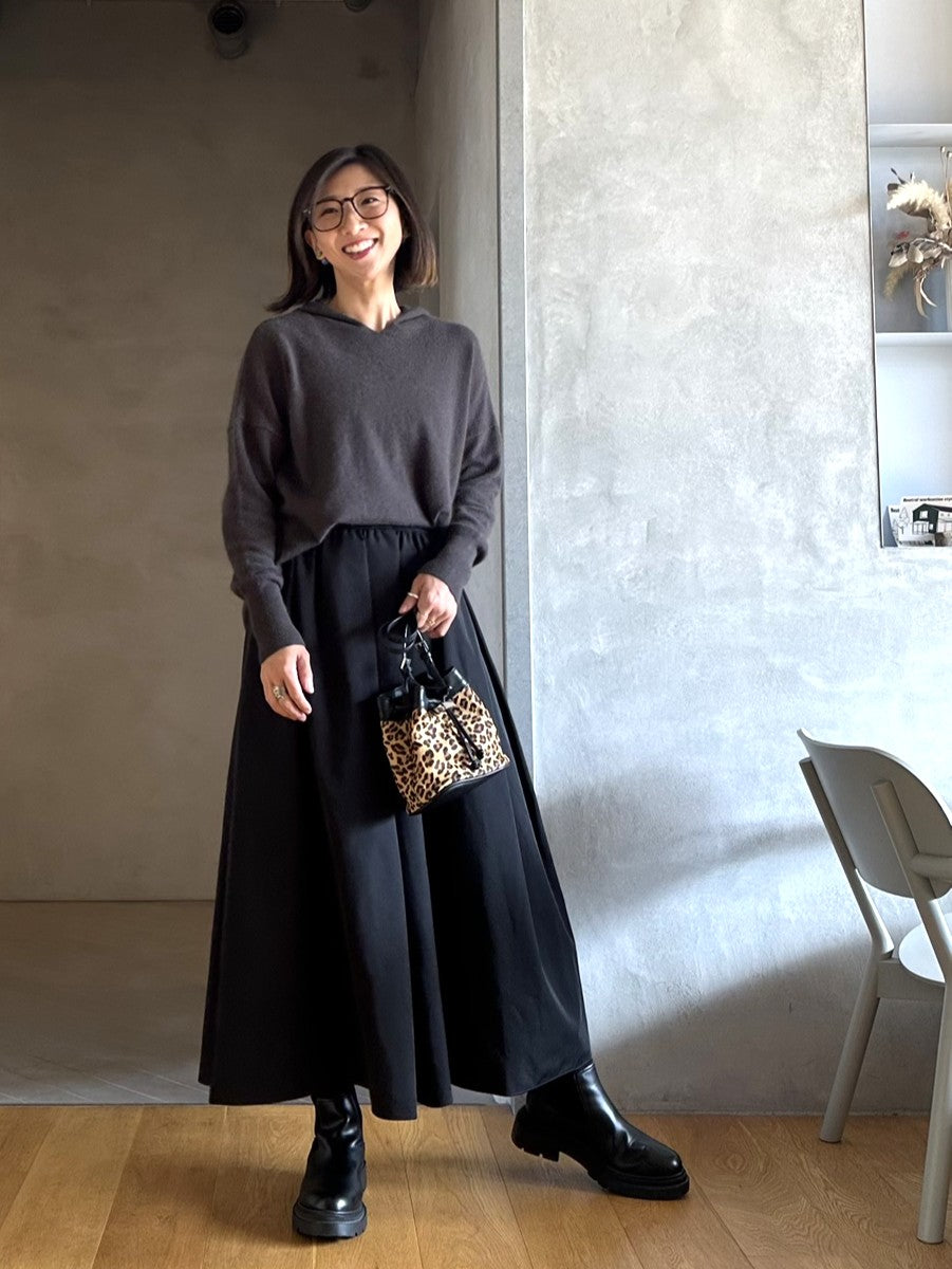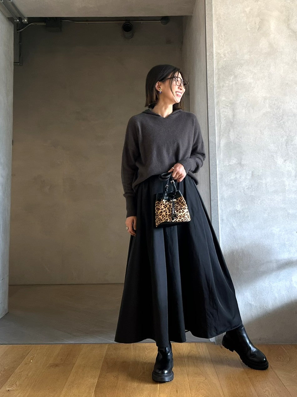 コーデが落ち着いた色味なので、ヒョウ柄の小物をポイントで入れてみました。