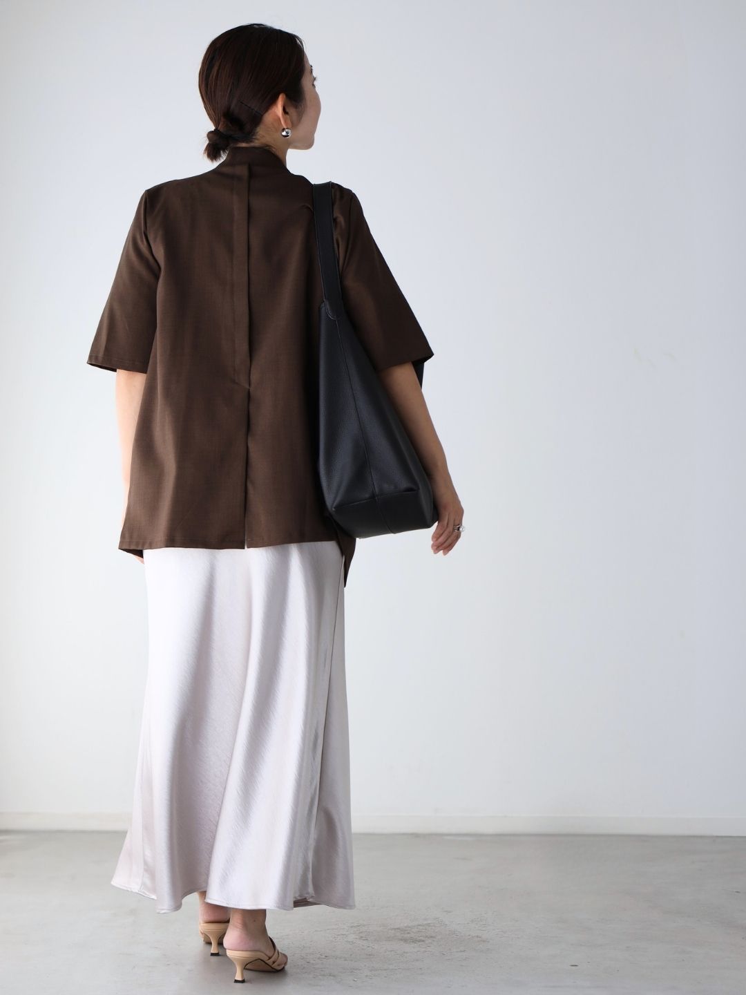 ベージュのシアートップスと艶スカートは、色を淡めであわせる事で女性らしい抜け感が◎