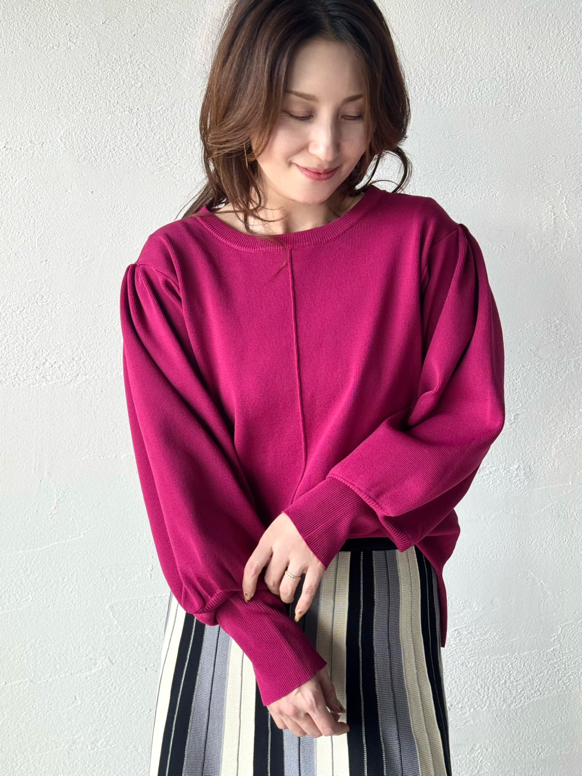 紫ピンクの柔らかなニットが顔まわりをぱっと明るくしてくれて、