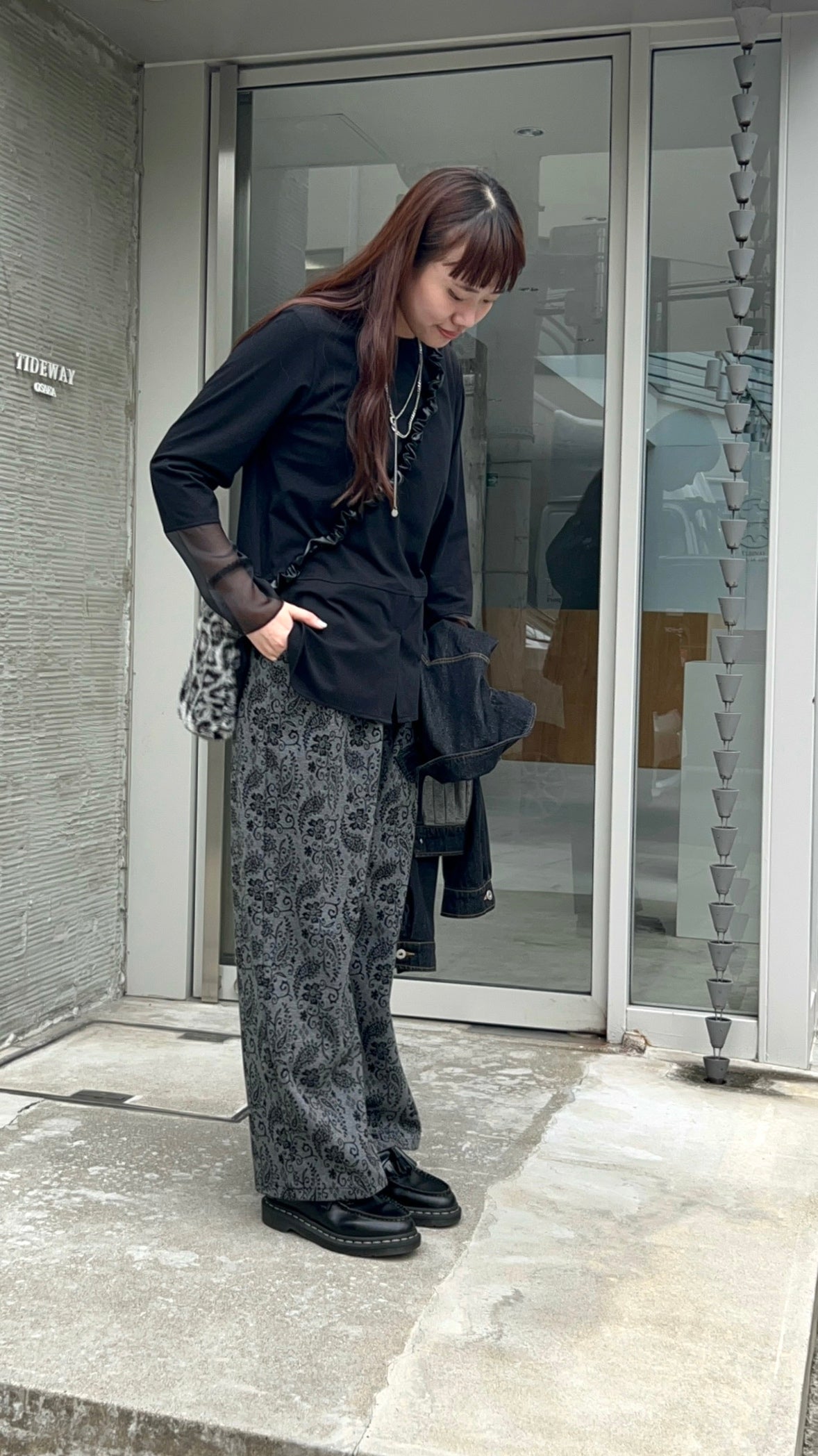 ボトムはグレーのペイズリーパンツで、モードな華やぎと快適さを両立。