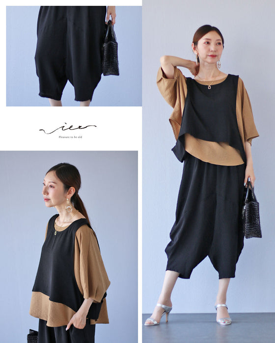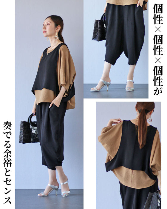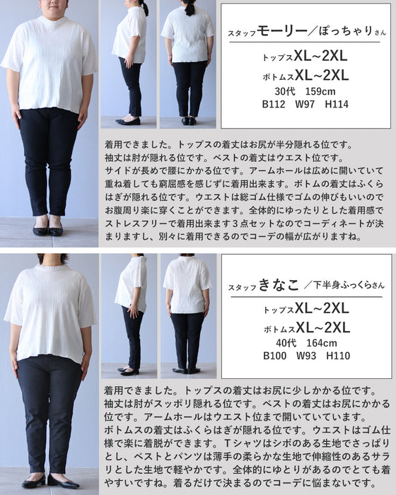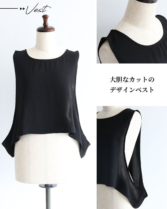 このセットアップは、トップス、ボトムス、ベストの3点で構成され、 変形デザインが個性的な印象を与えます。