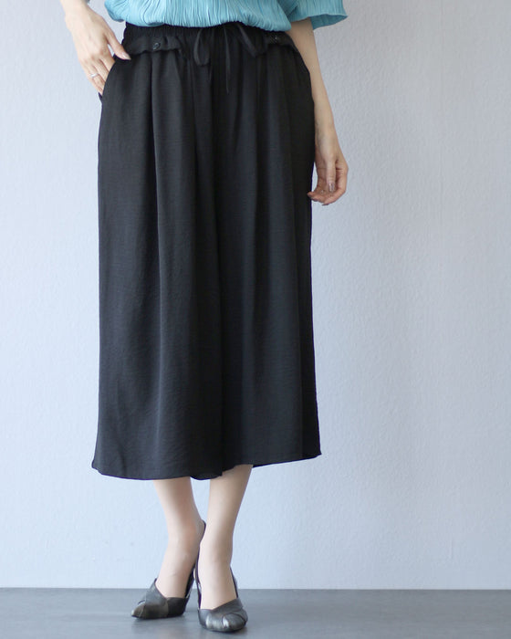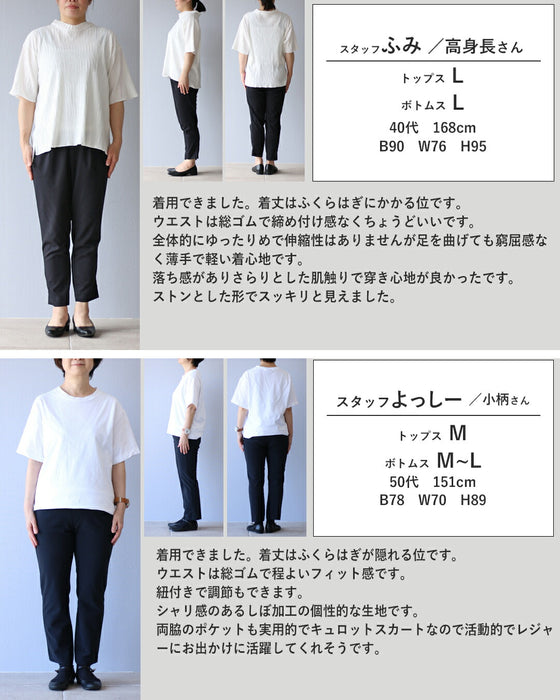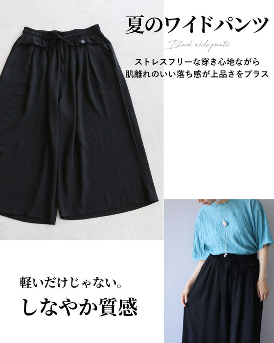 柔らかな素材を使用し、夏でもさらりとした着心地を提供します。 ワイドパンツのシルエットは体型をカバーしつつ、 絶妙なタックで細見え効果を発揮します。