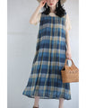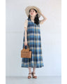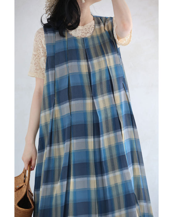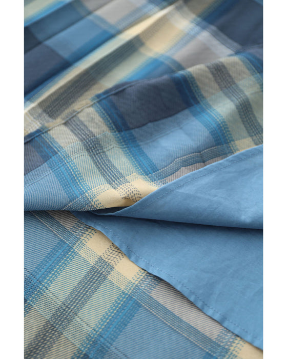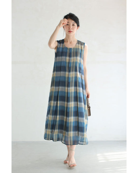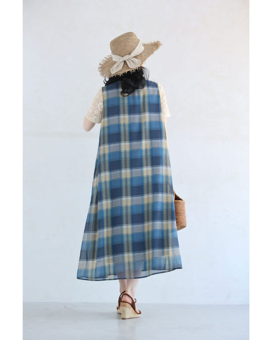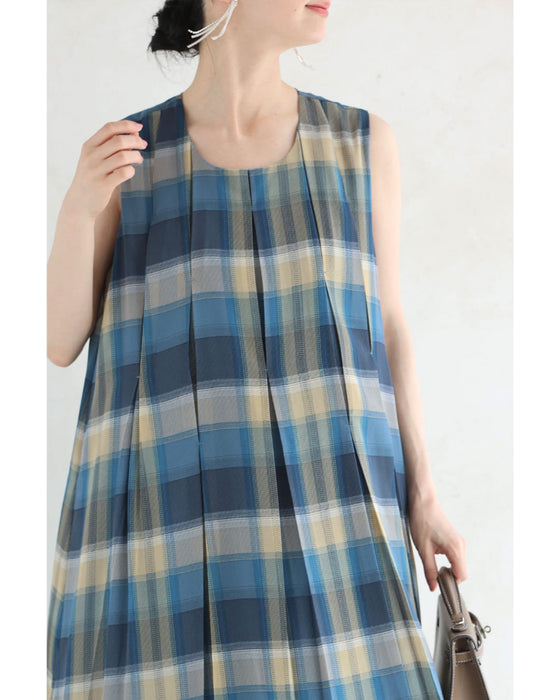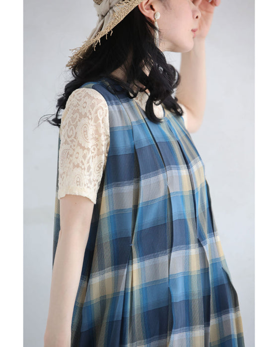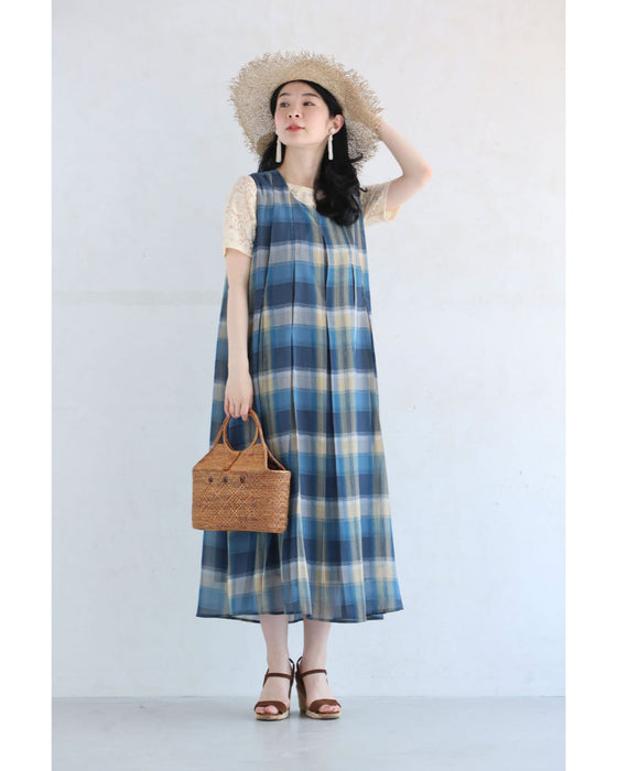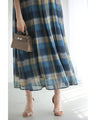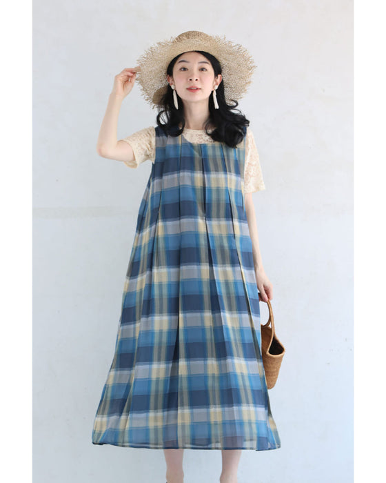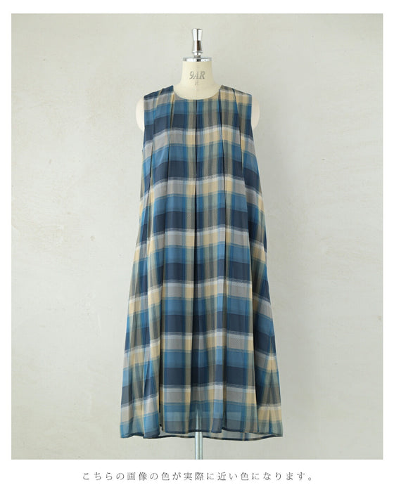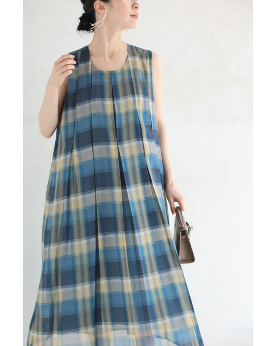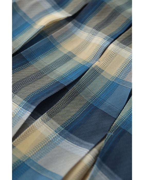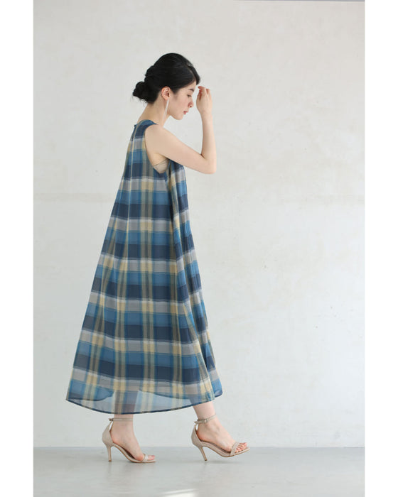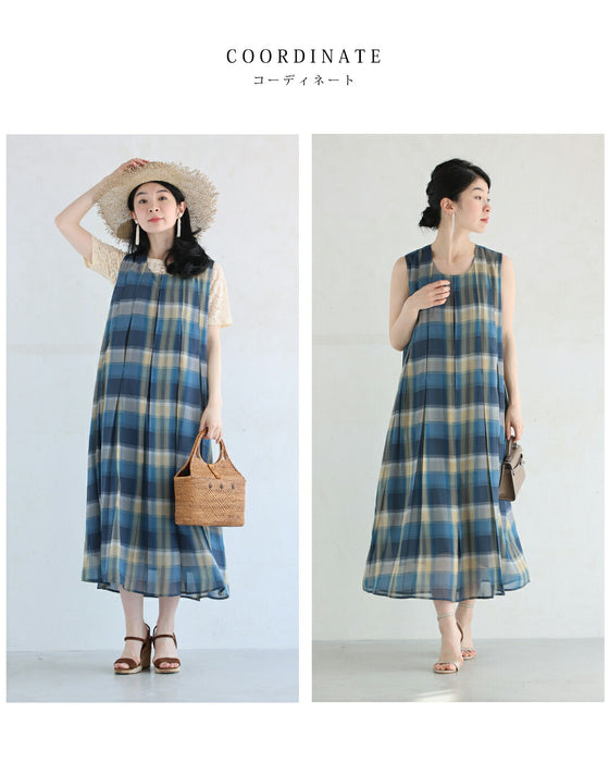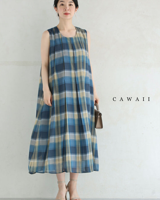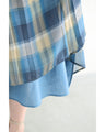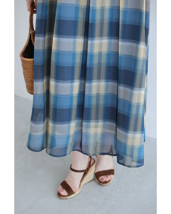 透け感のあるブルー系チェックでも、裏地があることでインナーのラインが響かず1枚でさらりと着られる。