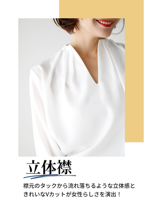 The three-dimensional effect that flows down from the tucks at the collar and the beautiful V-cut create a feminine look!