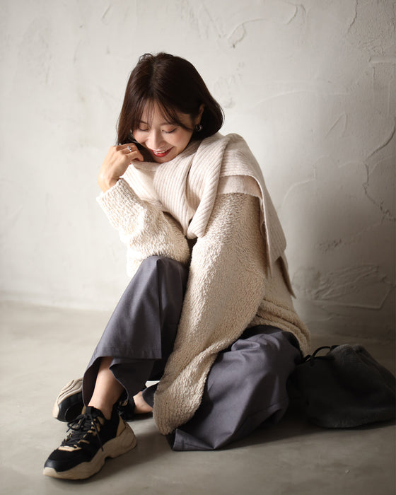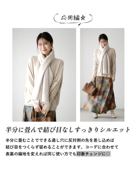 Advanced version: Fold it in half and tie it without knots for a neat silhouette. By folding it in half, you can insert the other end into the hole that is made and fasten it without tying a knot. By changing the knitting pattern on the front and back to match your outfit, you can change the impression even with the same usage.