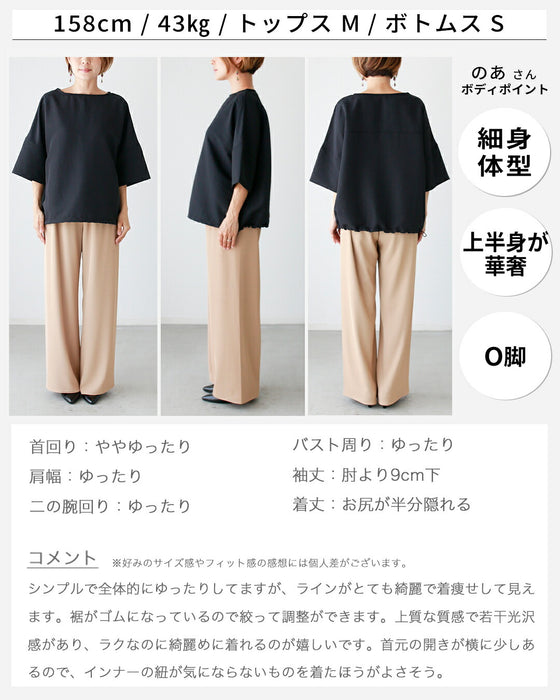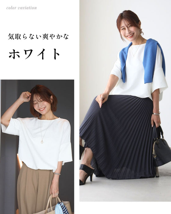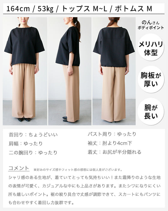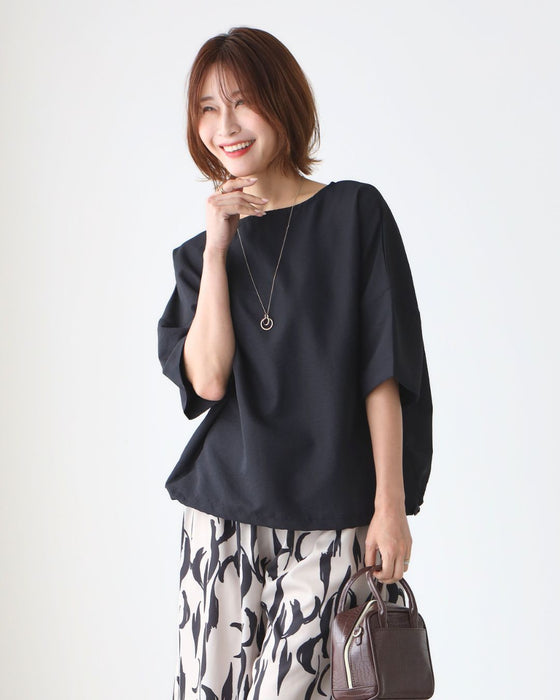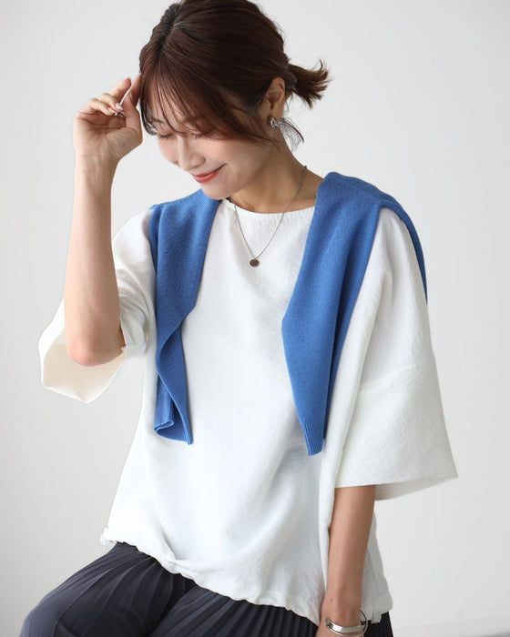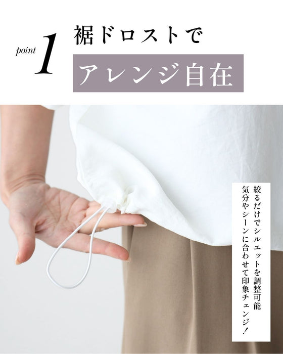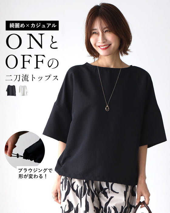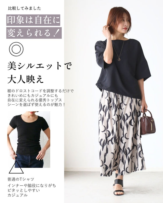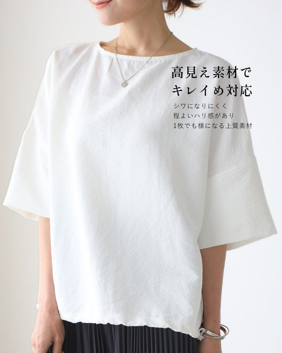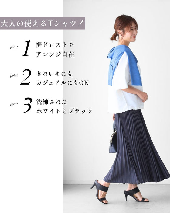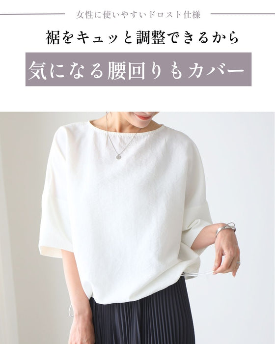 ドロスト半袖ブラウス 半袖 綺麗め カジュアル トップス ドロスト付き 裾のコード ちりめん シワにならない Tシャツ さらっと ブラウス ブラック ホワイト black white 黒 白 春 夏 秋 フリーサイズ レディース ファッション Ehre style スタイル エーレスタイル