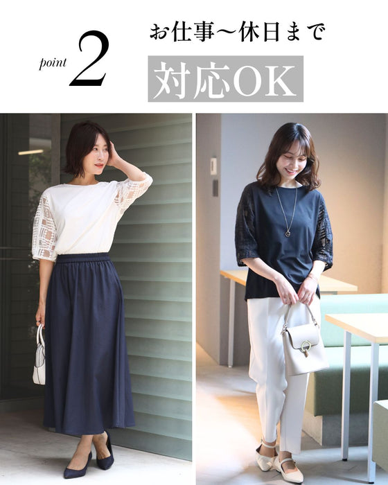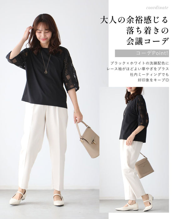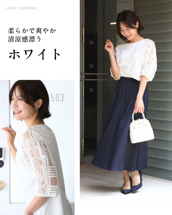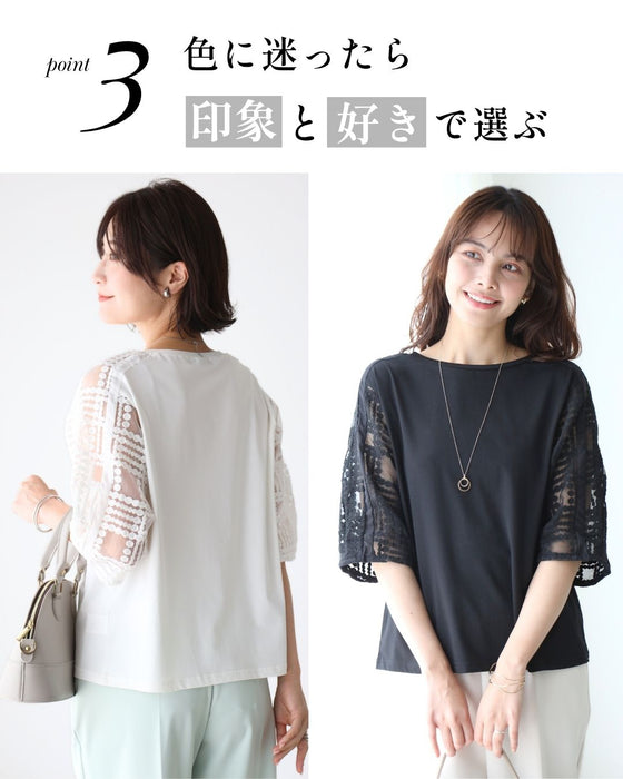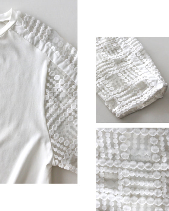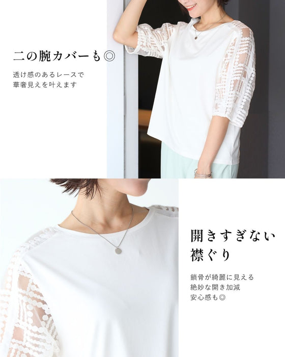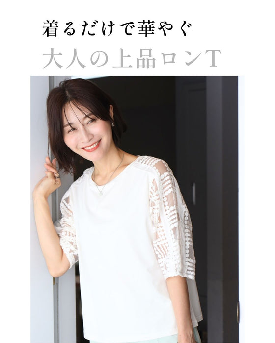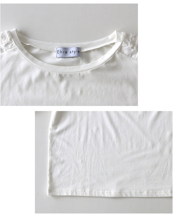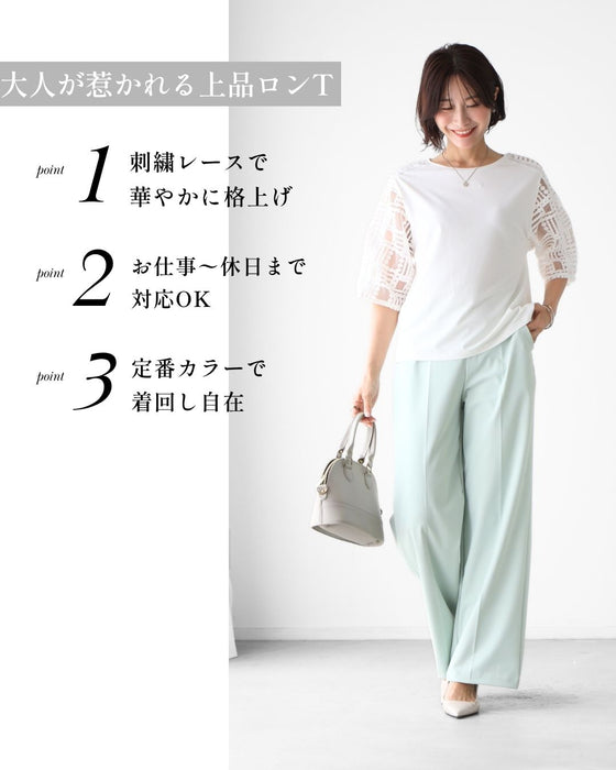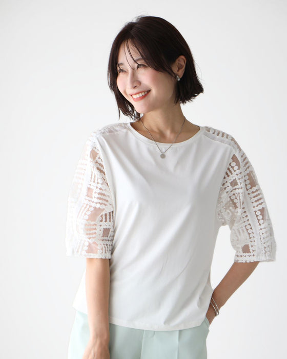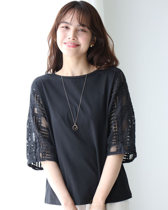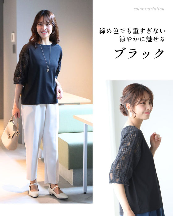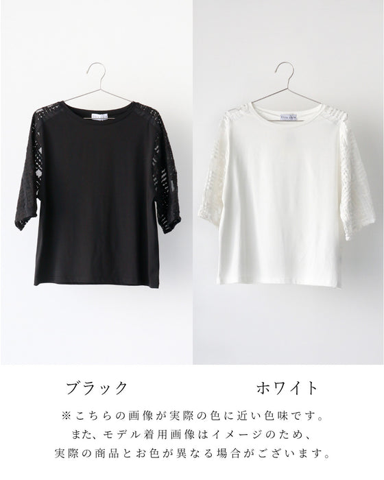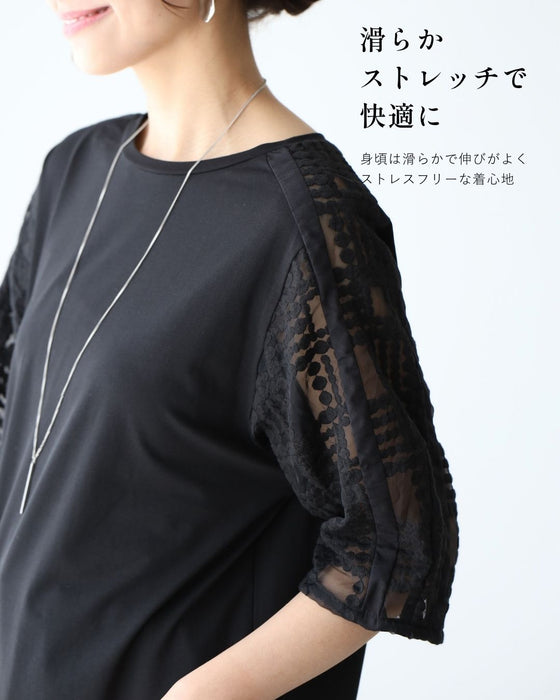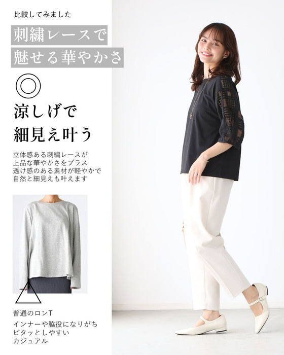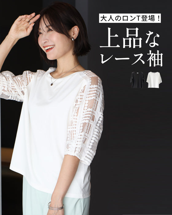 トップス Tシャツ レース袖 レース 接触冷感 涼しい 刺繍 ストレッチ 上品 お洒落 カットソー 透け感 抜け感 オフィス カジュアル ブラック ホワイト Black White 黒 白 春 夏 秋 フリーサイズ レディース ファッション Ehre style スタイル エーレスタイル