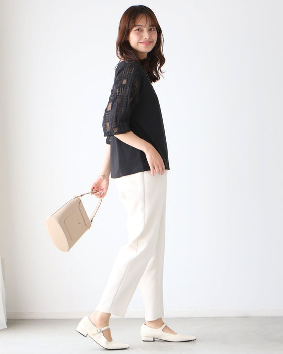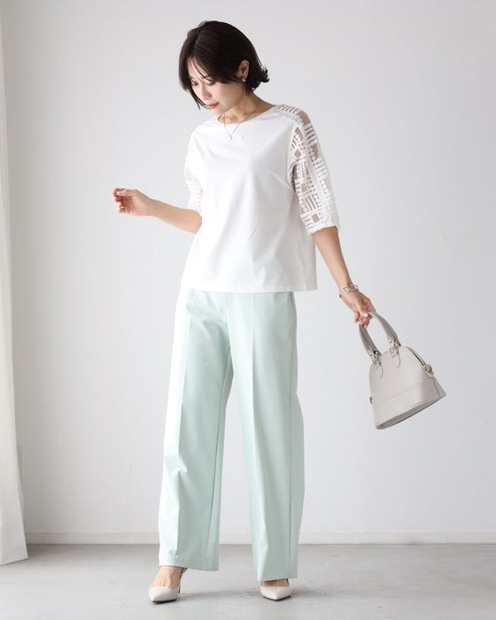 立体感ある刺繍レースが上品な華やかさをプラス。透け感のある素材が軽やかで、自然と細見えも叶えます。
