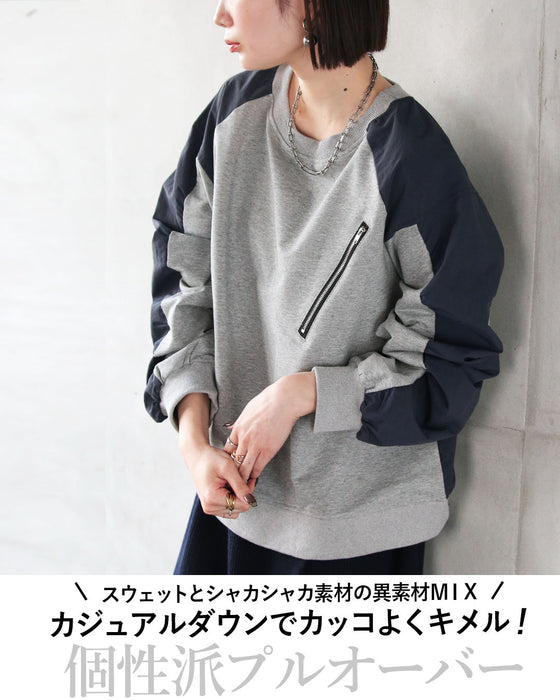 ■単調になりがちな無地コーデのアクセントになるスウェットとシャカシャカ素材の異素材MIX。スポッと着るだけでカジュアルダウンでカッコよくキメル!異素材使いが個性とセンスの良さを感じさせてくれるプルオーバー。