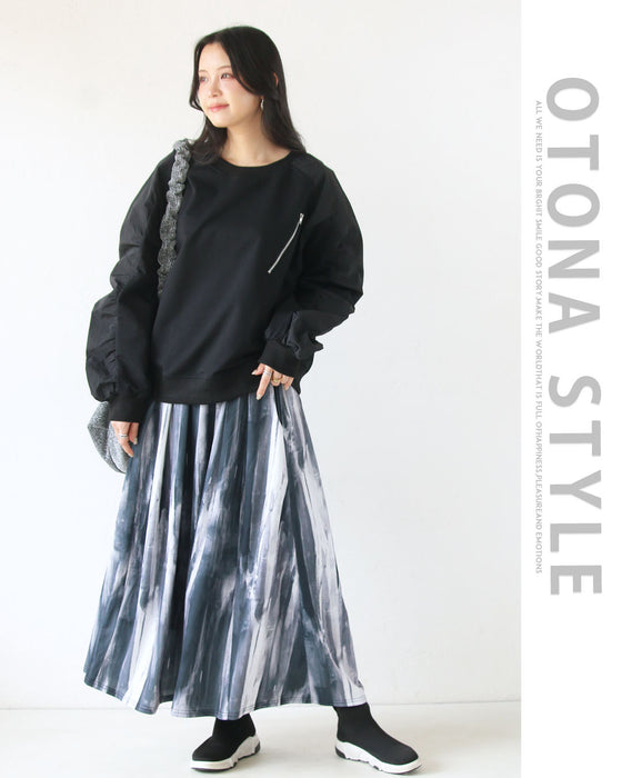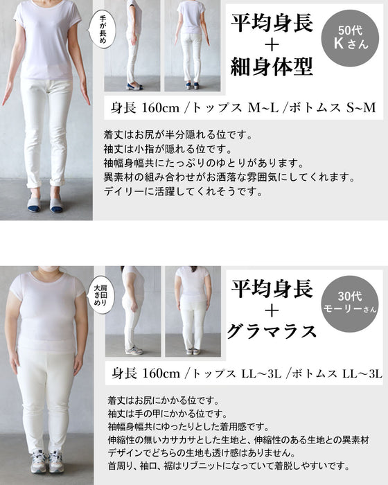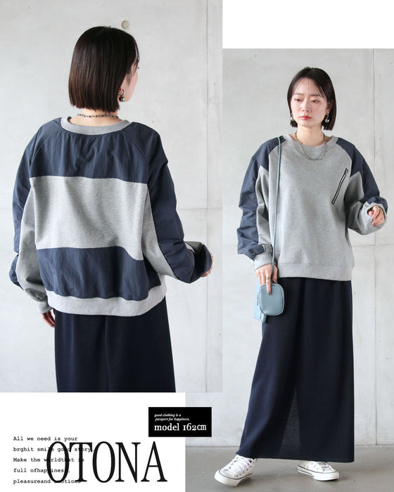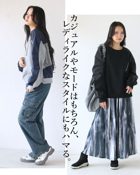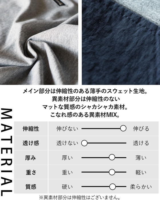 ■メイン部分は伸縮性のある薄手のスウェット生地。異素材部分は伸縮性のないマットな質感のシャカシャカ素材。こなれ感のある異素材MIX。