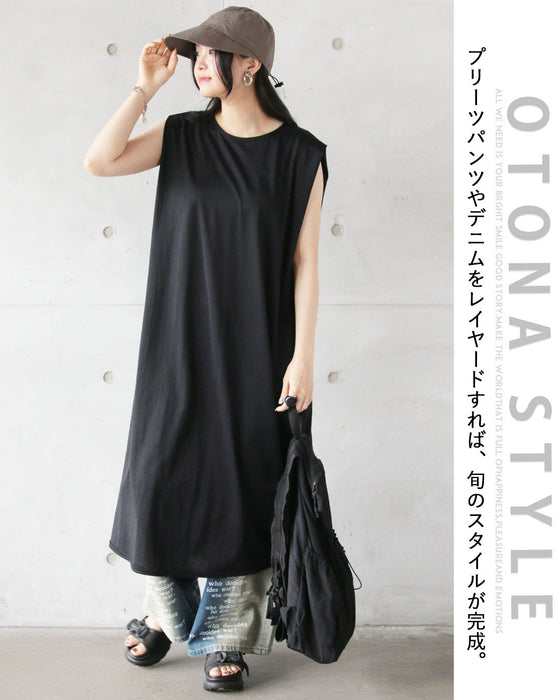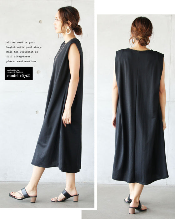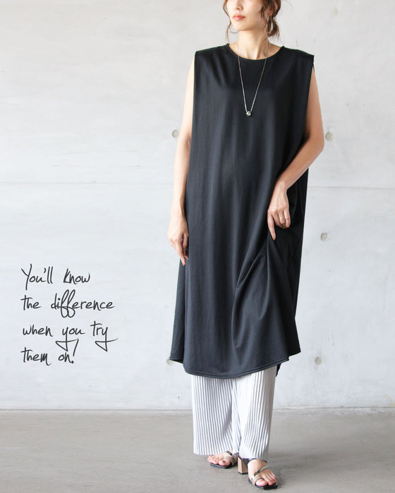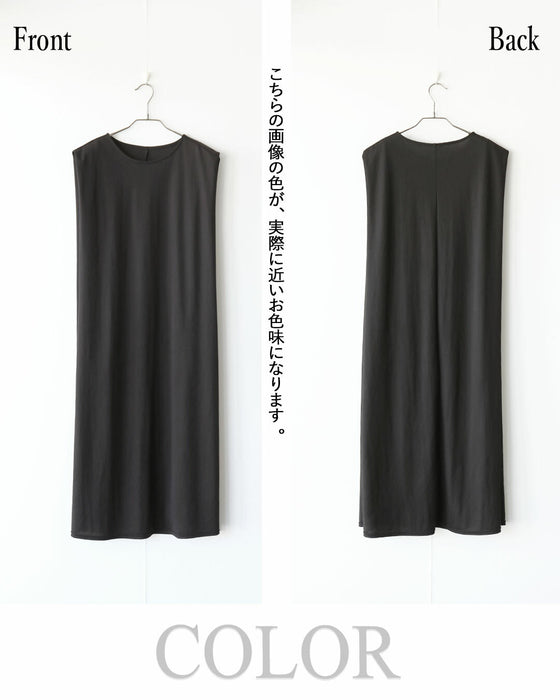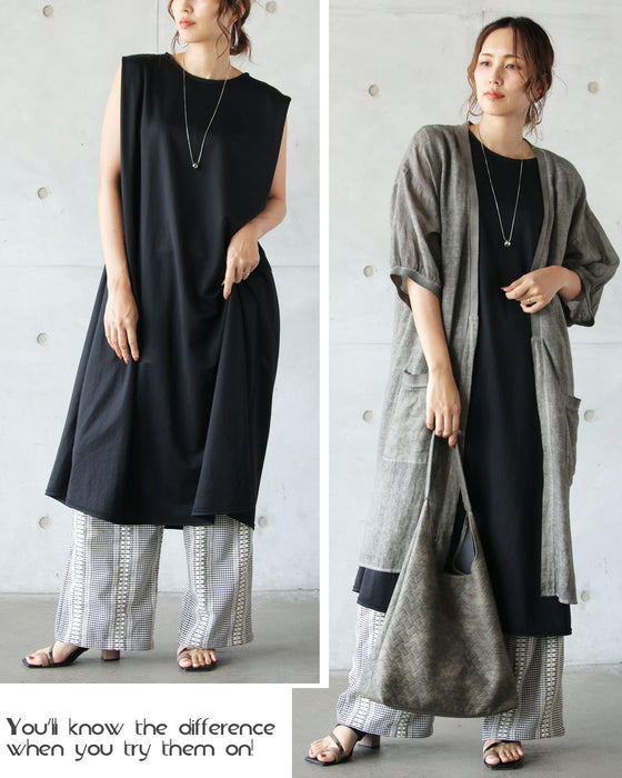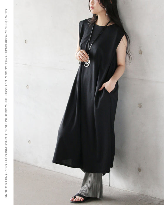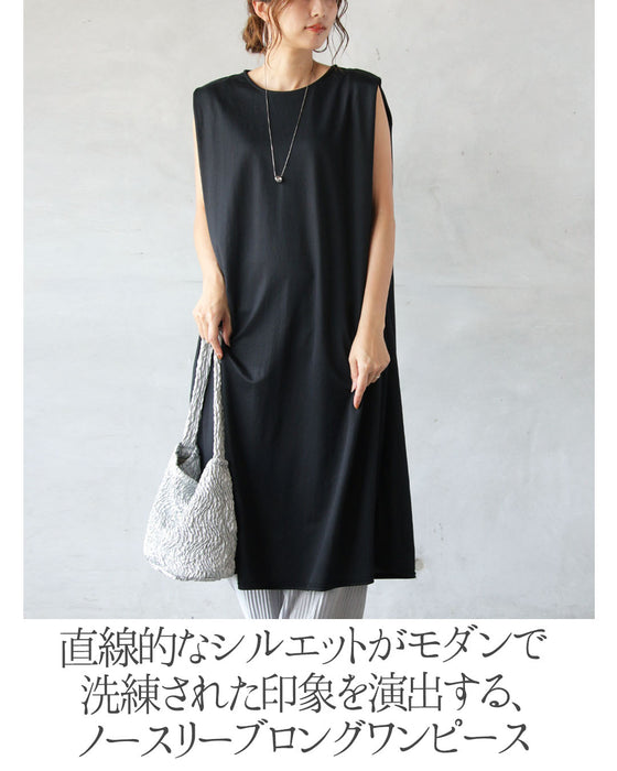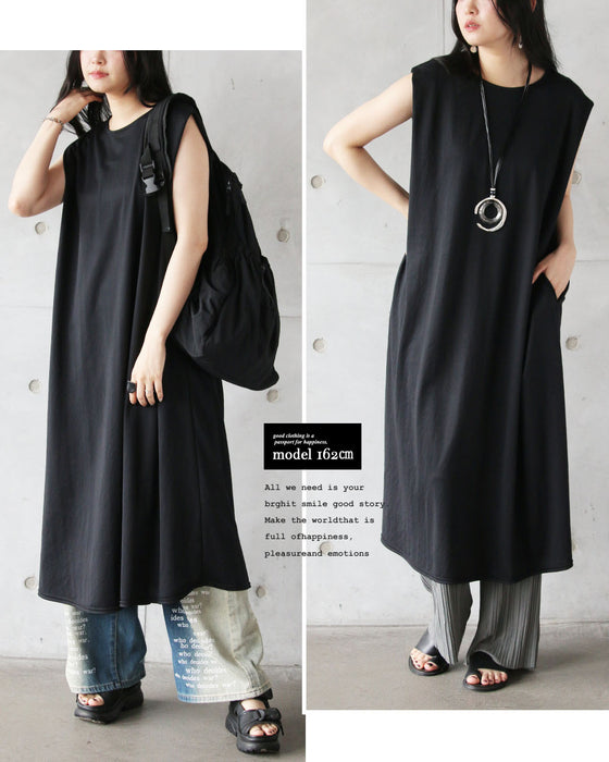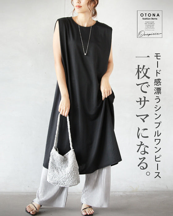 直線的なシルエットがモダンで洗練された印象を演出する、ノースリーブロングワンピース。肩のラインを程よく覆う幅広のノースリーブと、裾にかけて緩やかに広がるAラインが、シンプルながらも存在感のある一枚です。サイドには便利なポケット付きで、実用性も◎。