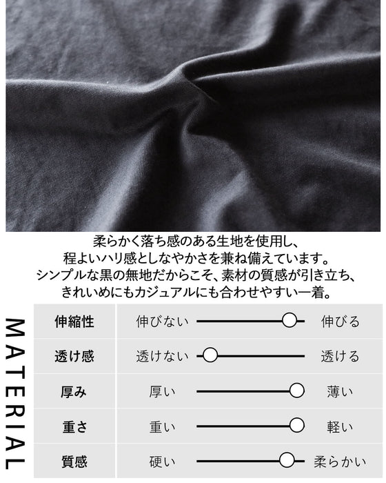 柔らかく落ち感のある生地を使用し、程よいハリ感としなやかさを兼ね備えています。シンプルな黒の無地だからこそ、素材の質感が引き立ち、きれいめにもカジュアルにも合わせやすい一着。