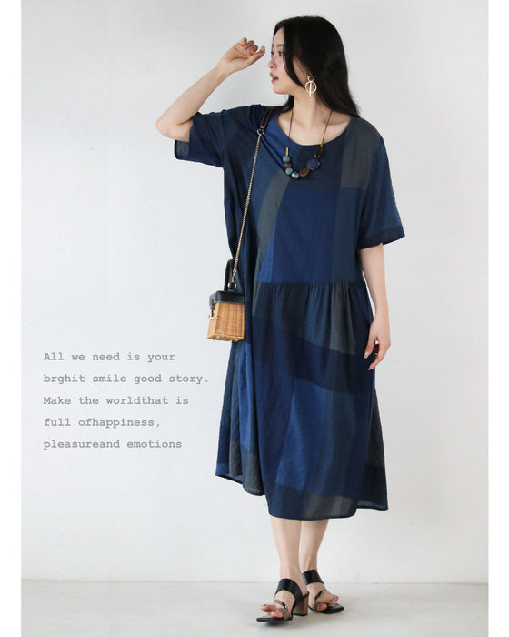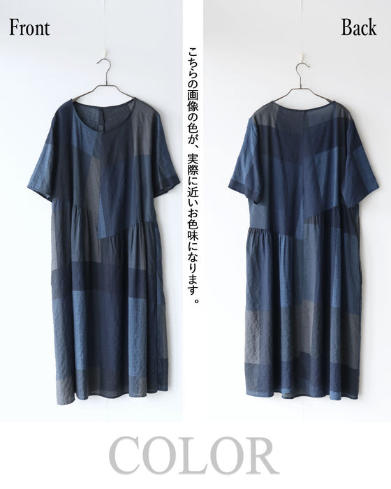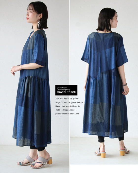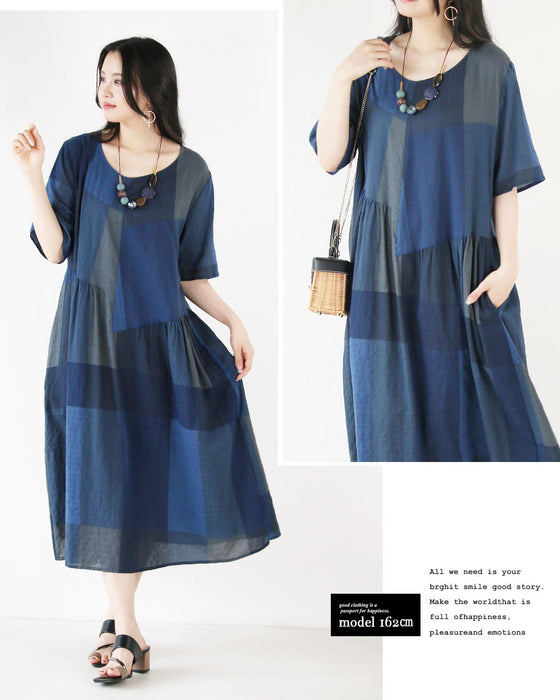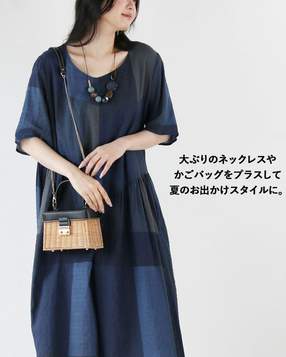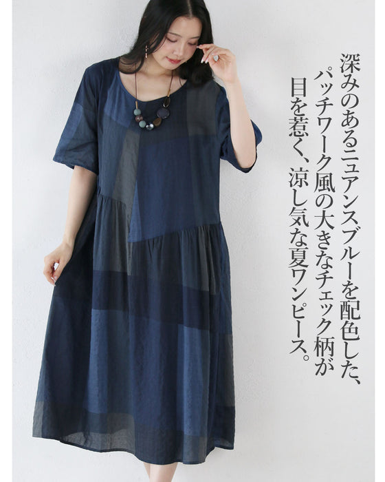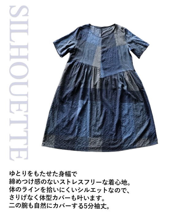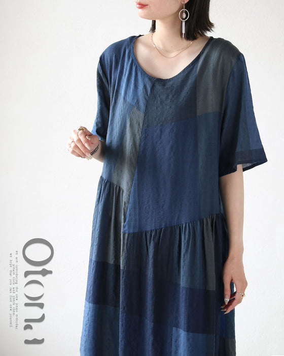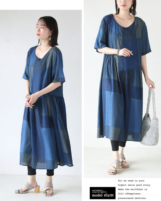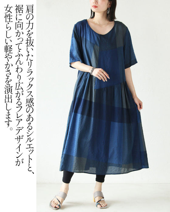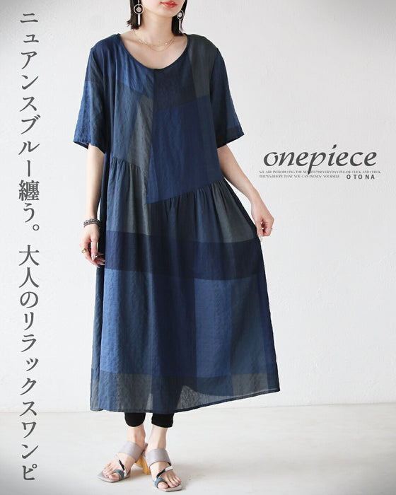 深みのあるニュアンスブルーのを活かした、大胆なブロックチェック柄が目を惹くワンピース。肩の力を抜いたリラックス感のあるシルエットと、裾に向かってふんわり広がるフレアデザインが女性らしい軽やかさを演出します。シンプルながらも個性が光る涼し気なワンピースです。