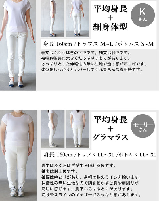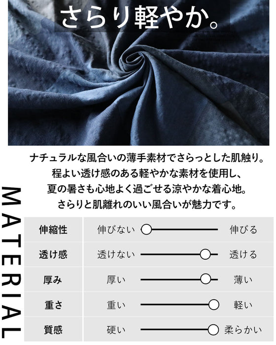程よい透け感のある軽やかな素材を使用し、夏の暑さも心地よく過ごせる涼やかな着心地。空気をはらむやわらかな質感が動くたびに表情を変え、さらりと肌離れのいい風合いが魅力です。
