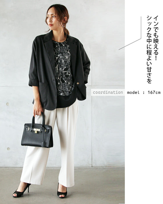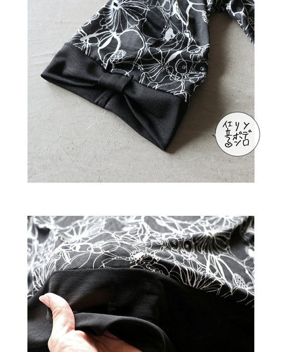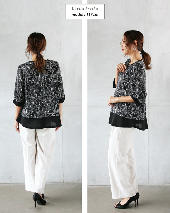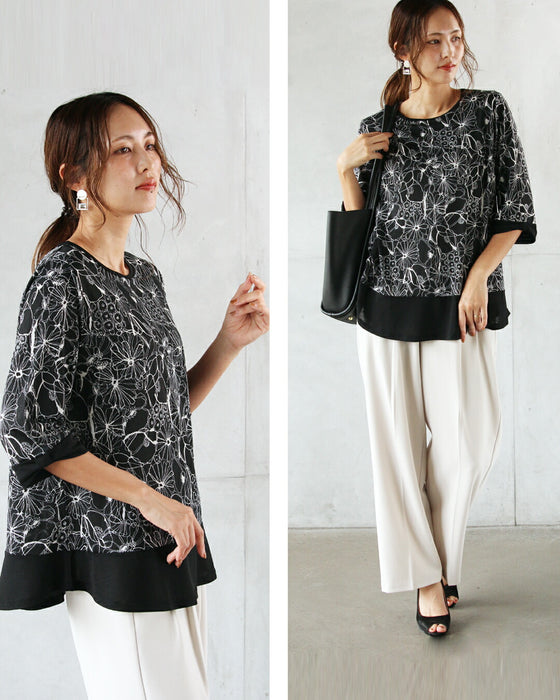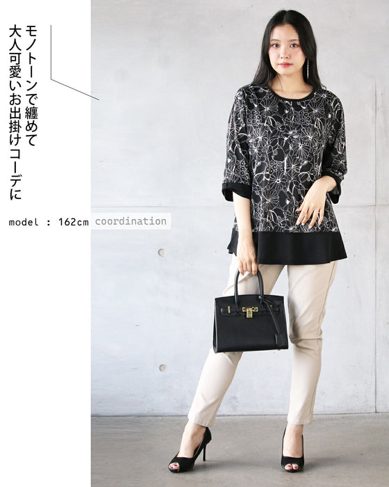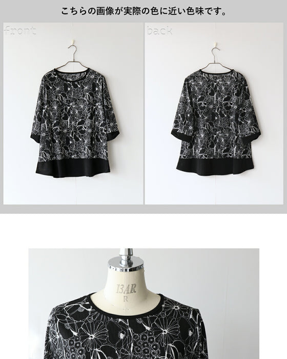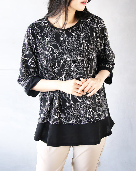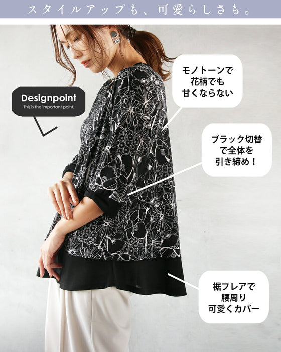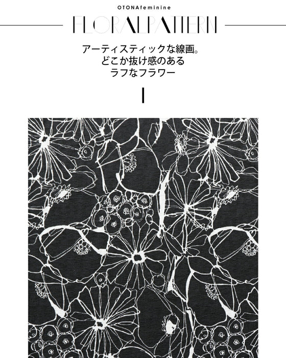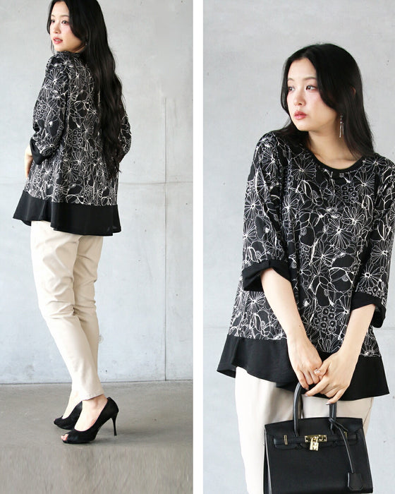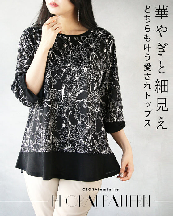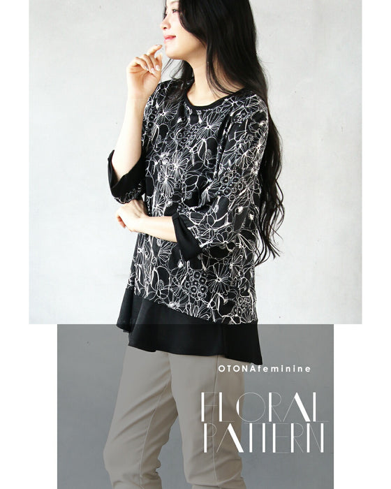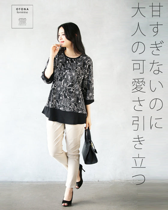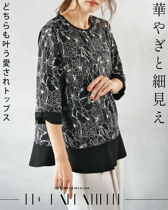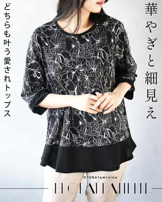 繊細な花柄をモノトーンで表現した、大人の可愛さが引き立つトップス。