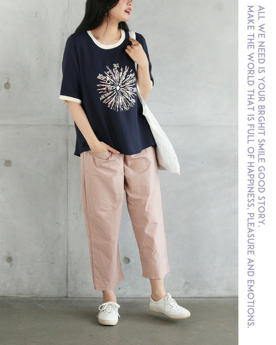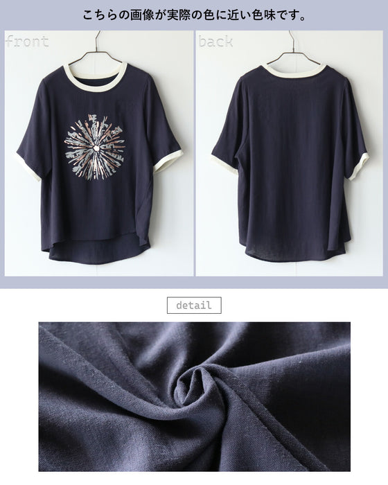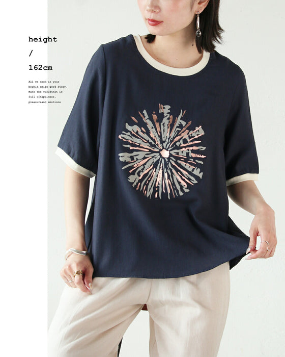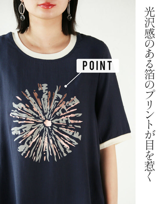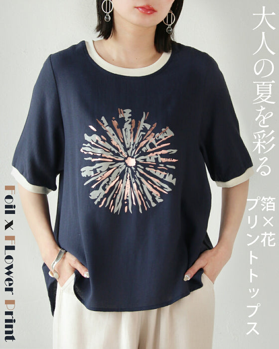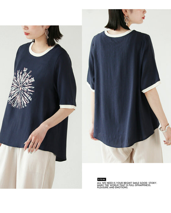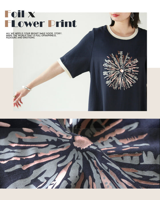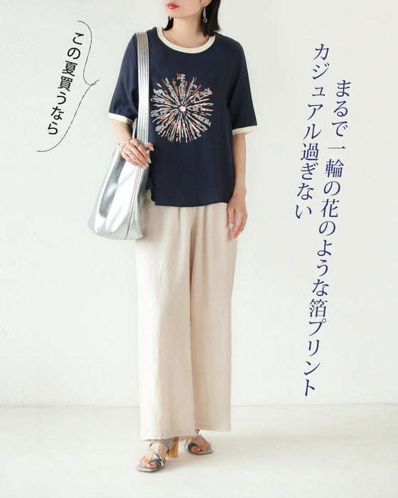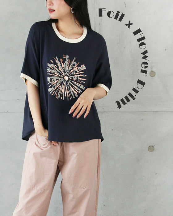 フロントに咲くのは、まるで一輪の花のような箔プリント。光を受けてほんのりきらめく、繊細で品のあるアクセントです。首元と袖口には優しいコントラストを効かせたバイカラーデザインを取り入れ、甘すぎずナチュラルに可愛さをプラス。