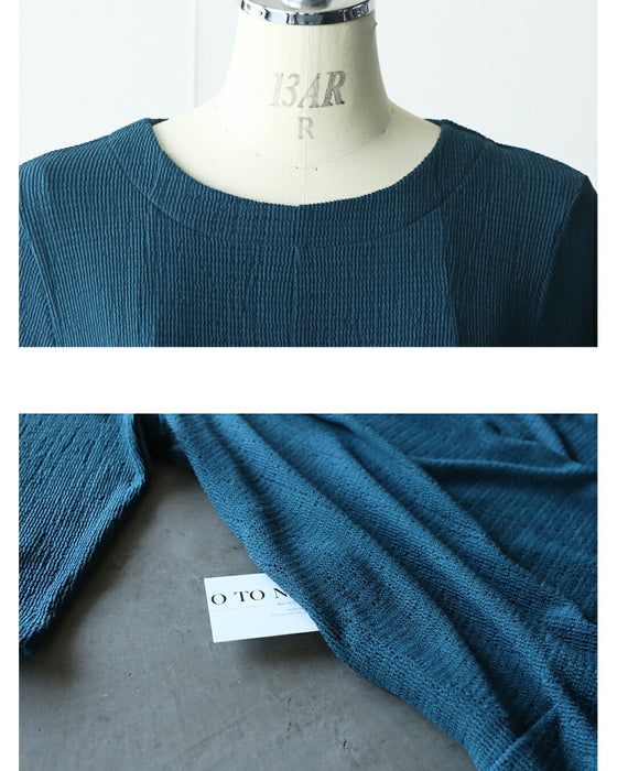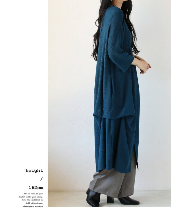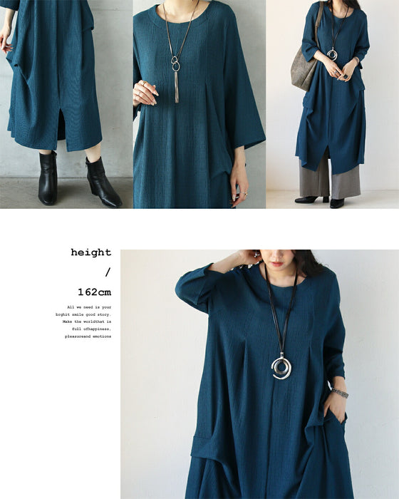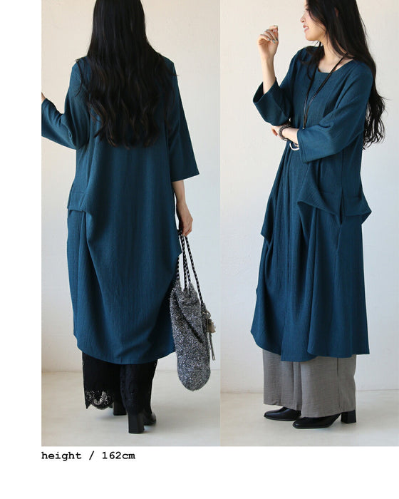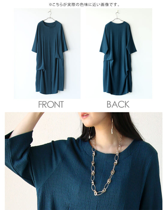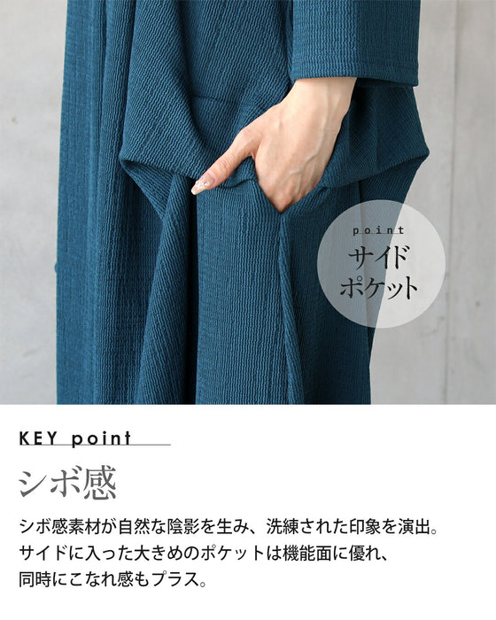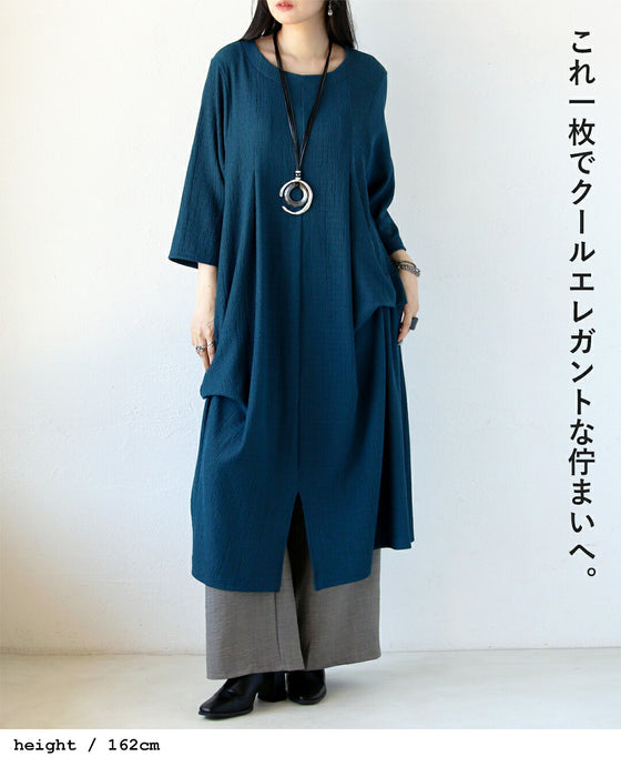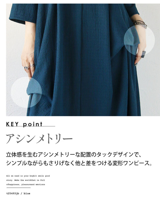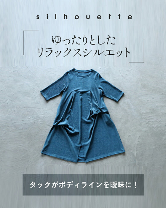 無造作タックで生まれる「大人の余裕」シルエット。 立体感を生むアシンメトリーな配置のタックデザインで、 シンプルながらもさりげなく他と差をつける変形ワンピース。 シボ感素材が自然な陰影を生み、洗練された印象を演出。 ほんのり縦ラインを強調する模様の入り方と落ち感を活かし細見え効果にも◎ サイドに入った大きめのポケットは機能面に優れ、同時にこなれ感もプラス。 これ一枚でクールエレガントな佇まいへ。