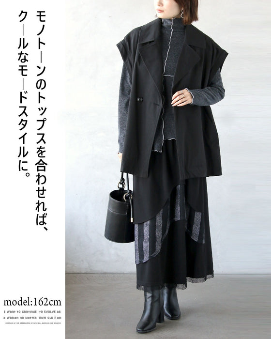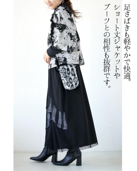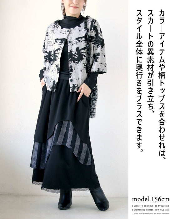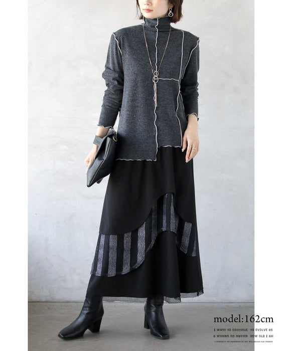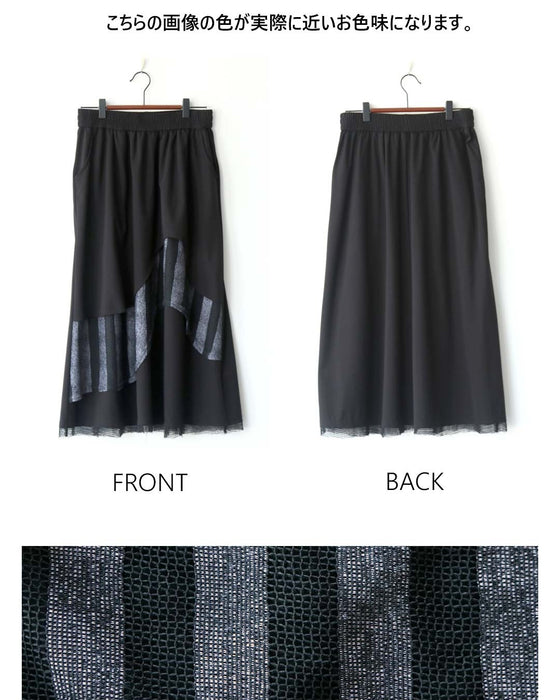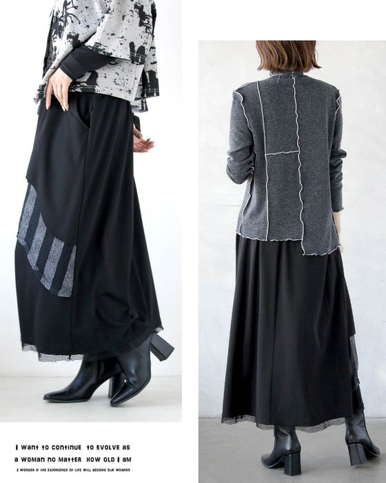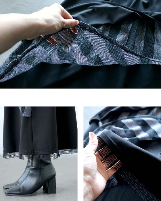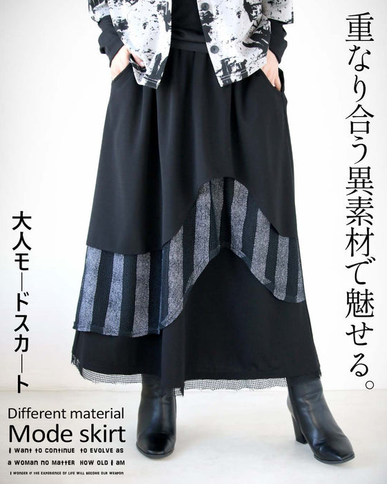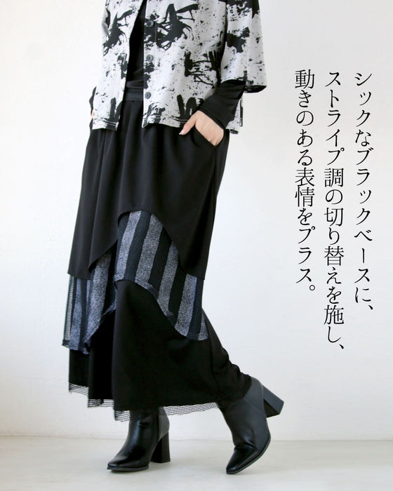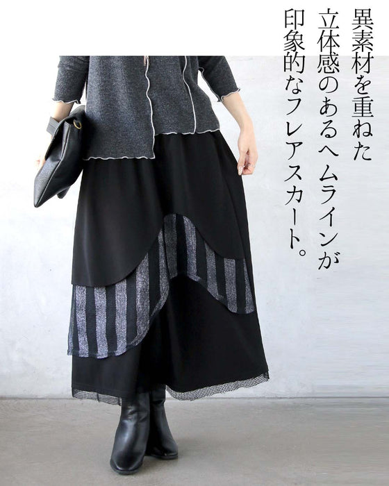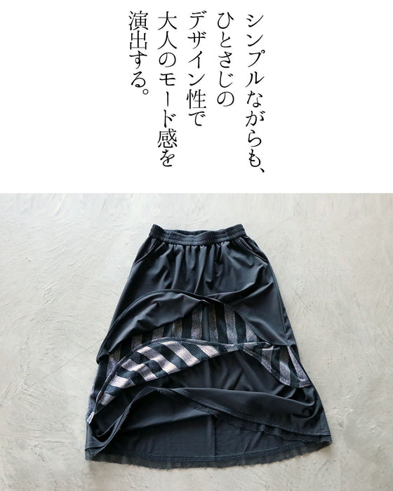 異素材を重ねた立体感のあるヘムラインが印象的なフレアスカート。 シックなブラックベースに、ストライプ調の切り替えを施し、動きのある表情をプラスしました。シンプルながらも、ひとさじのデザイン性で大人のモード感を演出します。