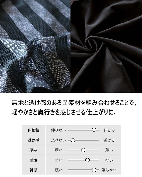 無地と透け感のある異素材を組み合わせることで、軽やかさと奥行きを感じさせる仕上がりに。落ち感のある素材で広がりすぎず、すっきりとしたシルエットを叶えます。