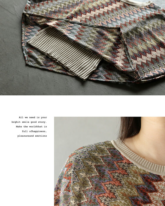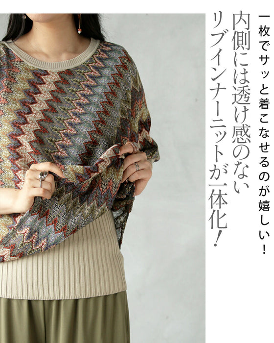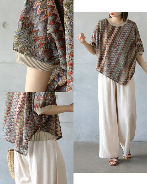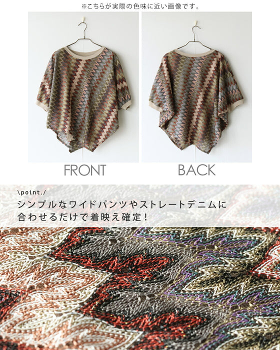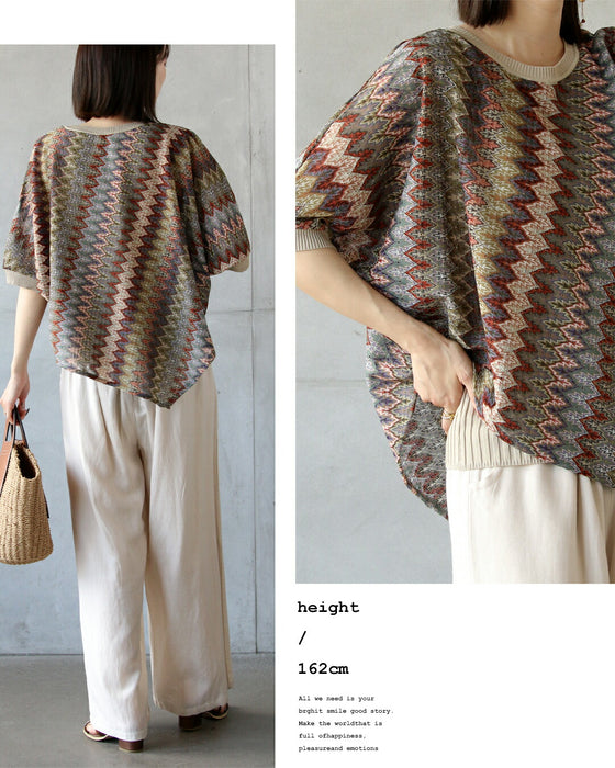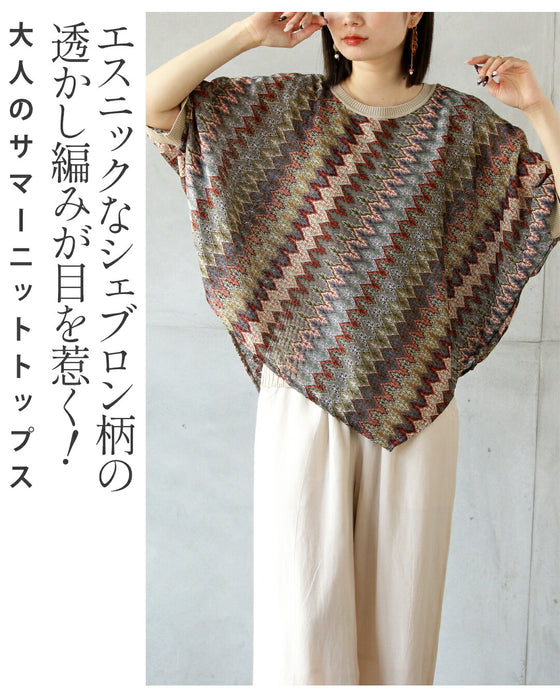 エスニックなシェブロン柄の透かし編みが目を惹く、大人のサマーニットトップス。