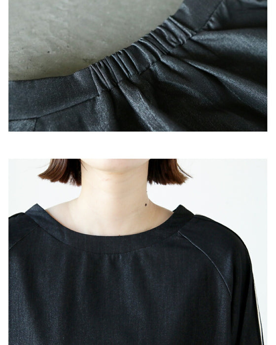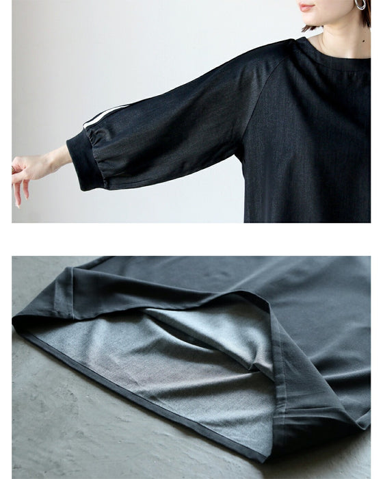 ほんのり光沢感のあるデニム調の風合いが、シンプルながらも品と表情のあるスタイルを演出。