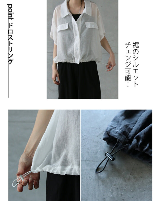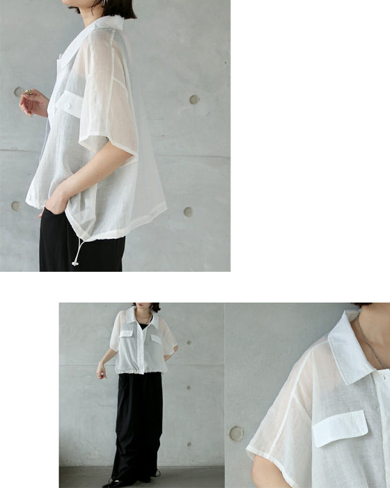 大人のスタイリングに抜け感をプラスしてくれる、シアー素材のシャツ。 ヒップラインにかかるかかからないかの絶妙なショート丈で、脚長効果も。 ドロストコード付きで裾のシルエットチェンジも可能。 フロントのポケットがカジュアル感をプラス。