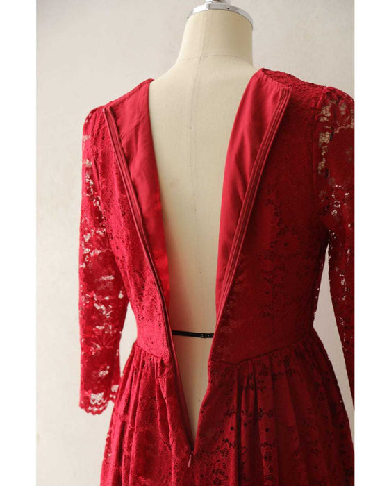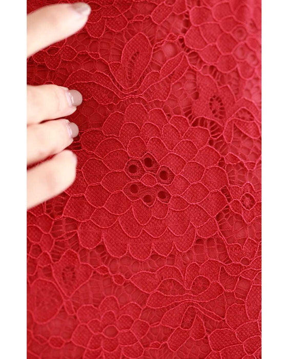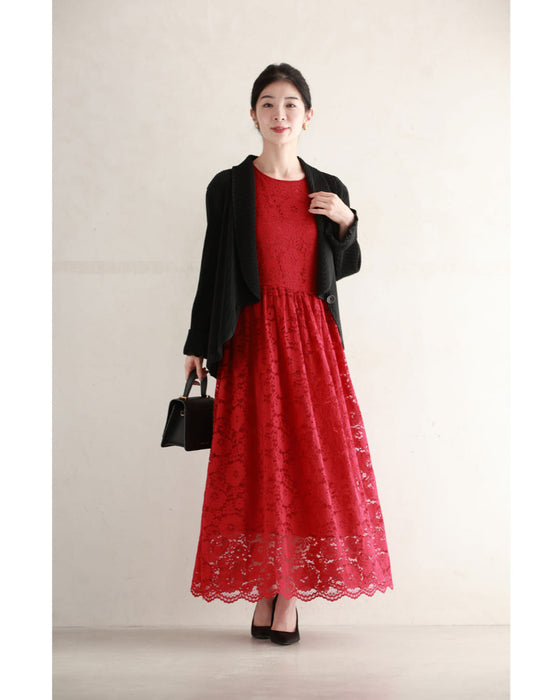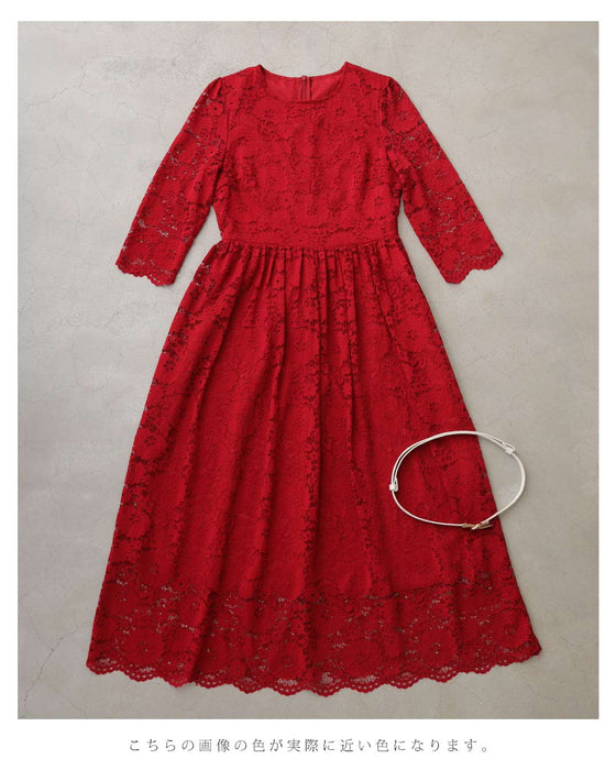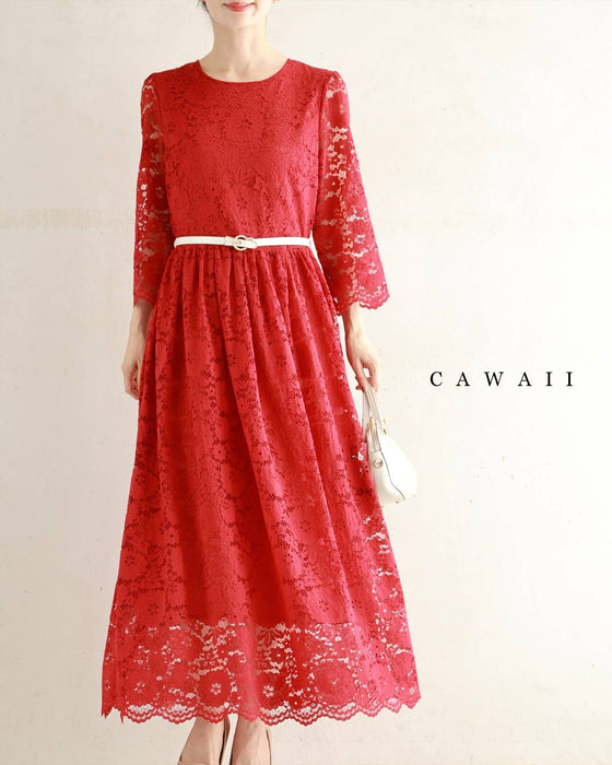 A long dress made entirely of lace and featuring a red dahlia (with belt)