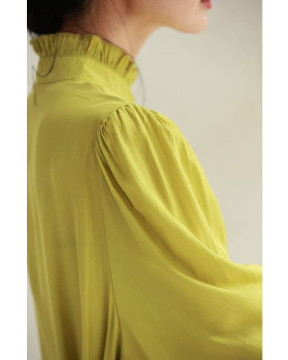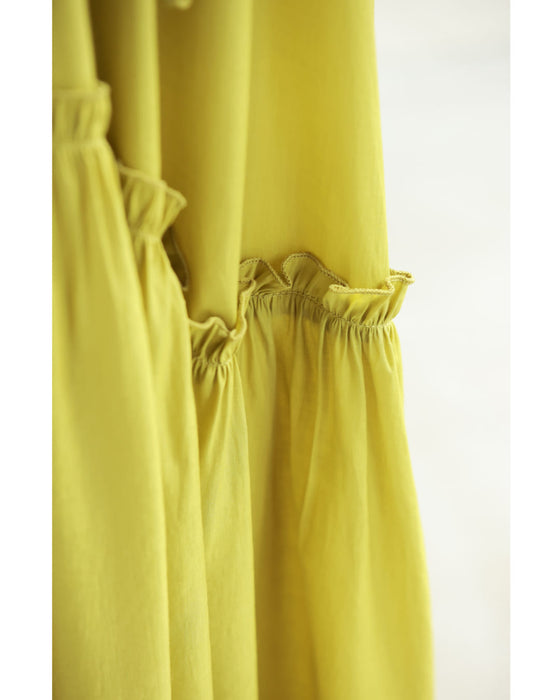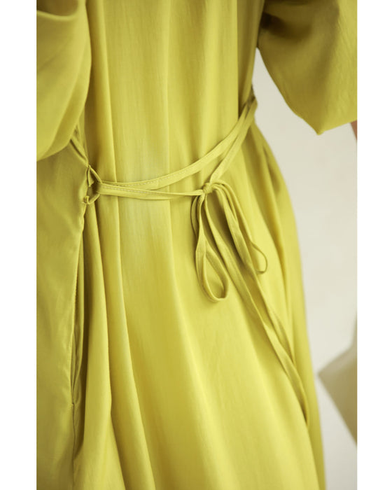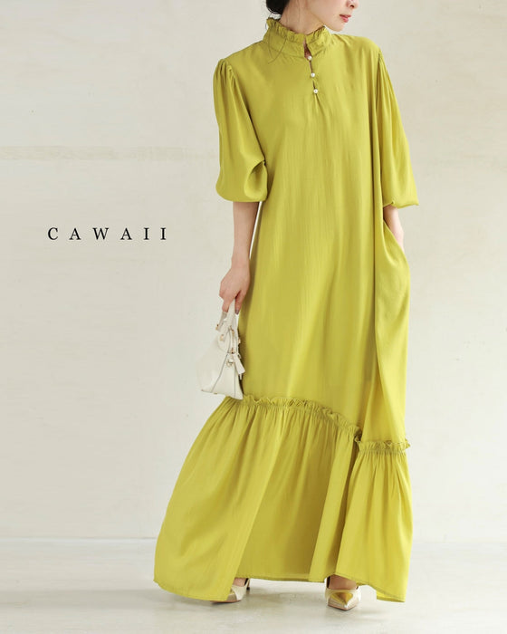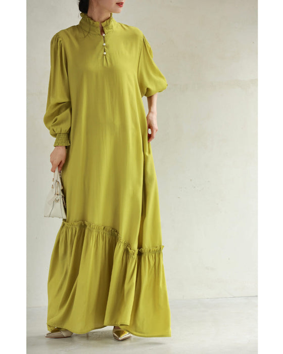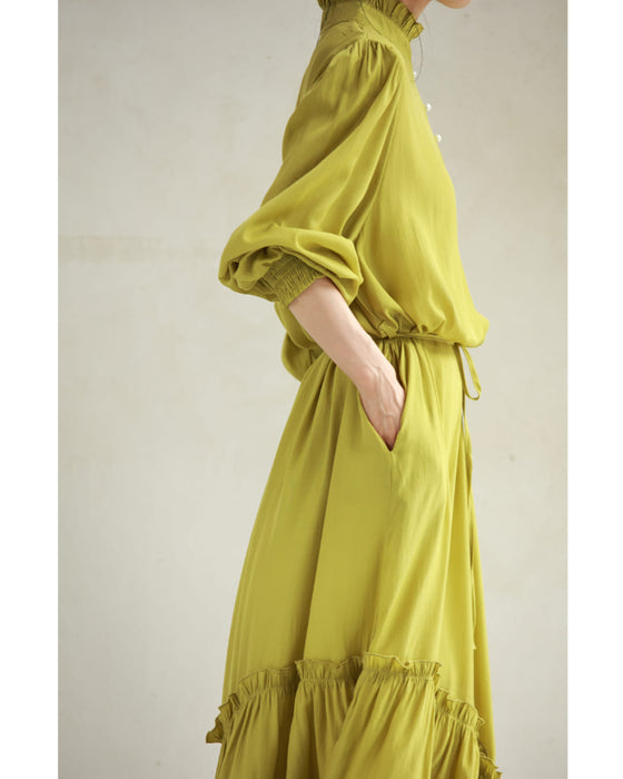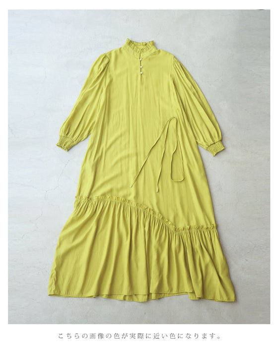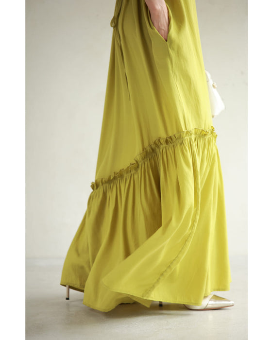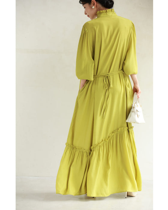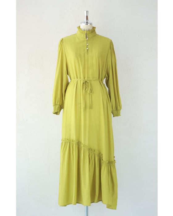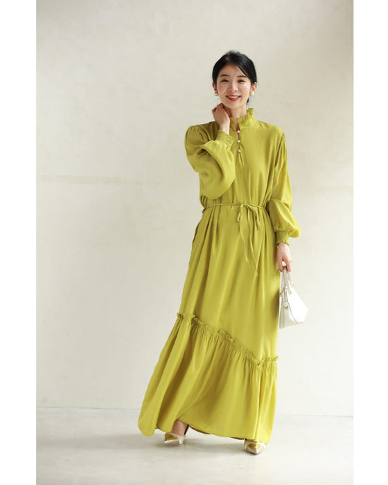 Pistachio color long dress with ruffled diagonal hem (with ribbon)