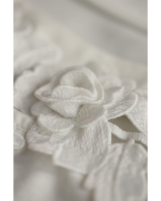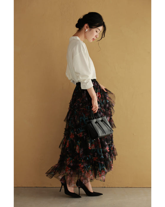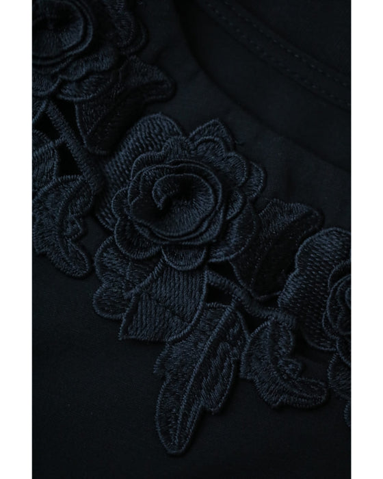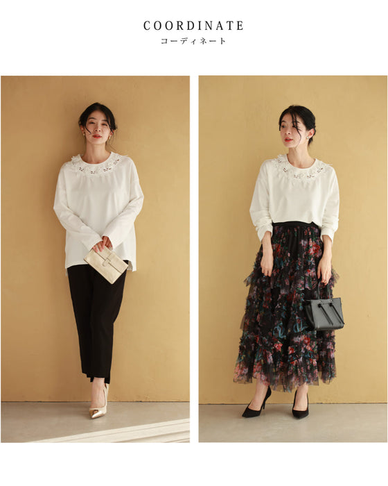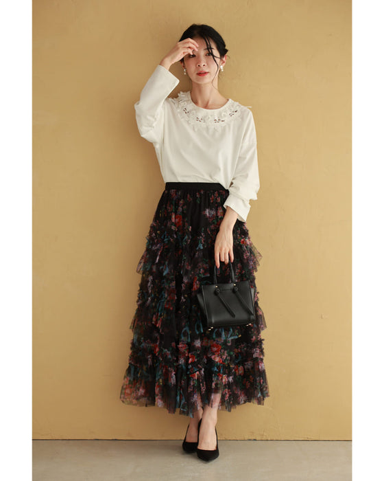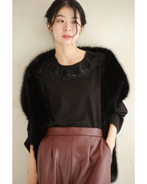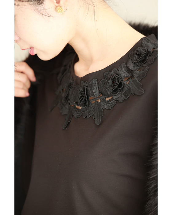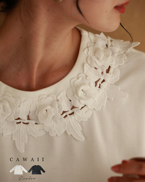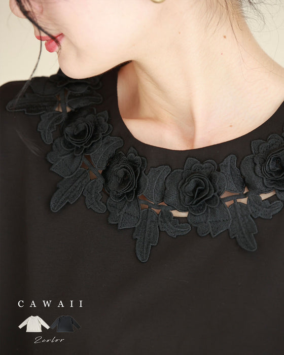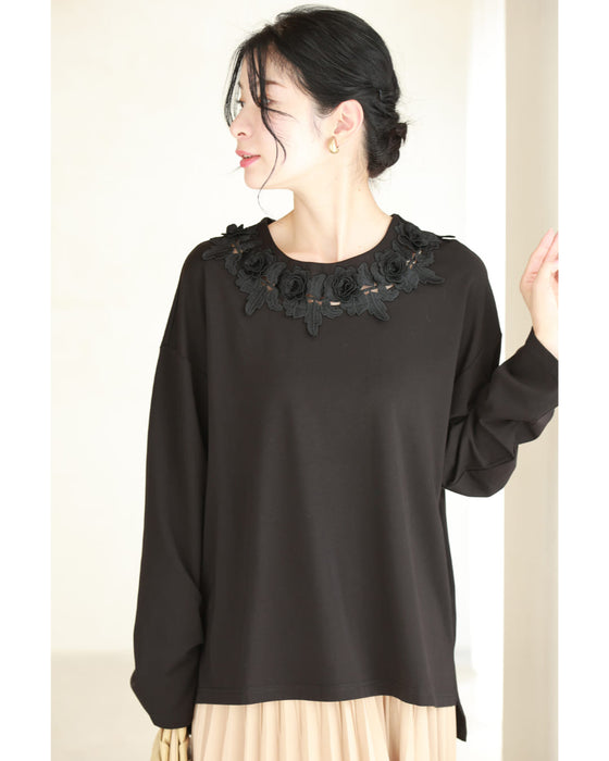 A pullover top with three-dimensional rose lace that brightens up the décolletage