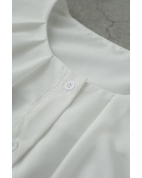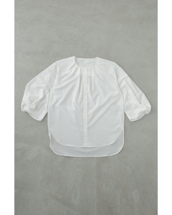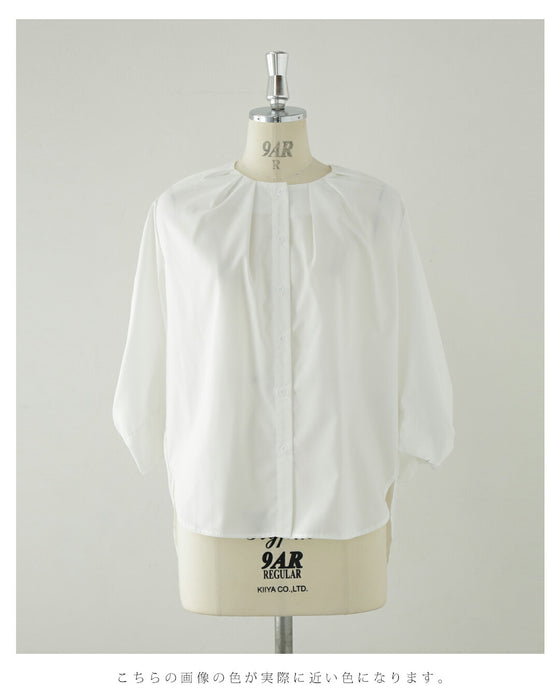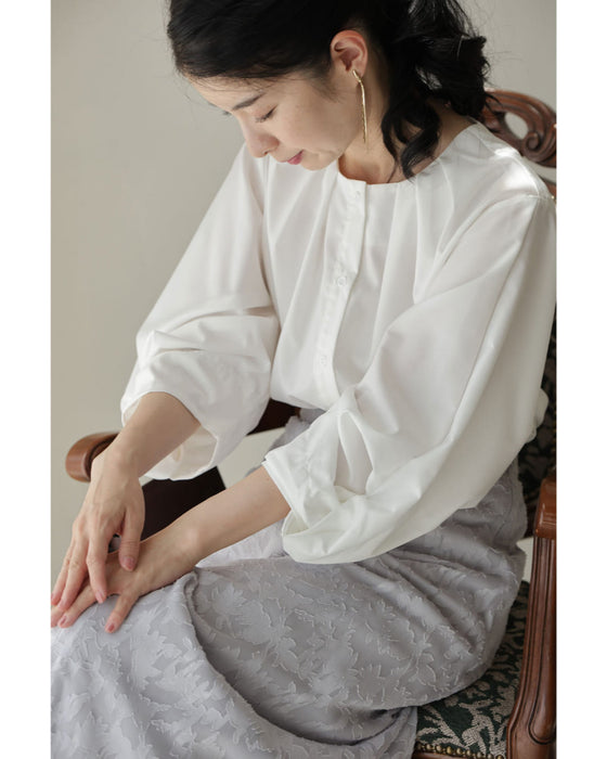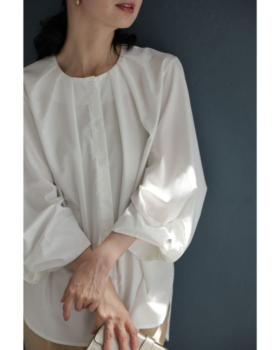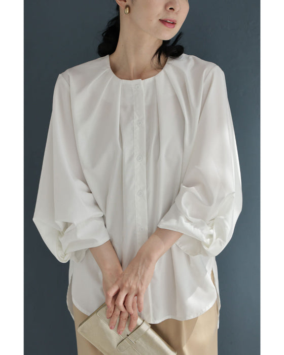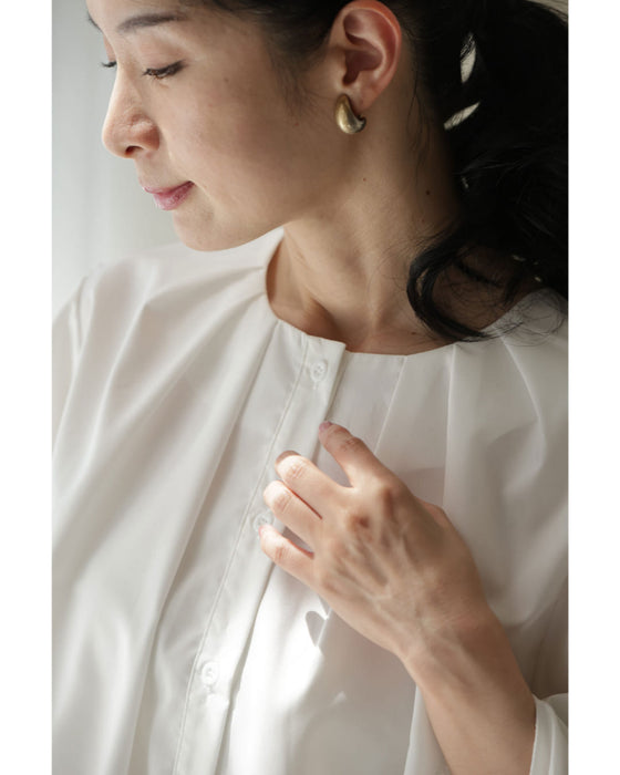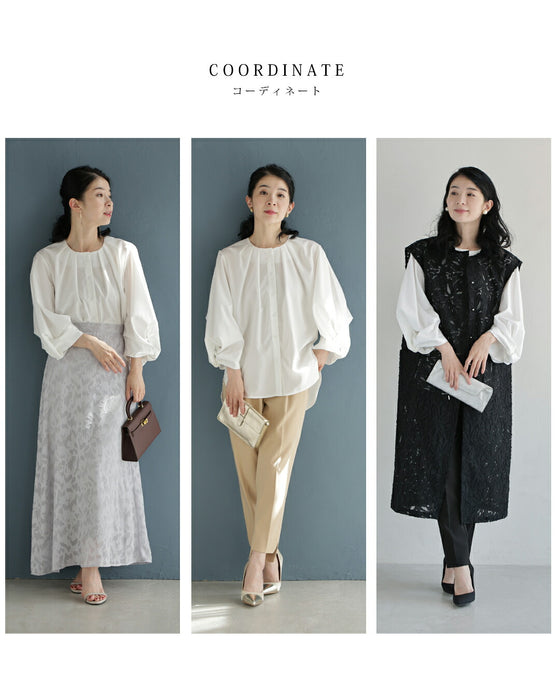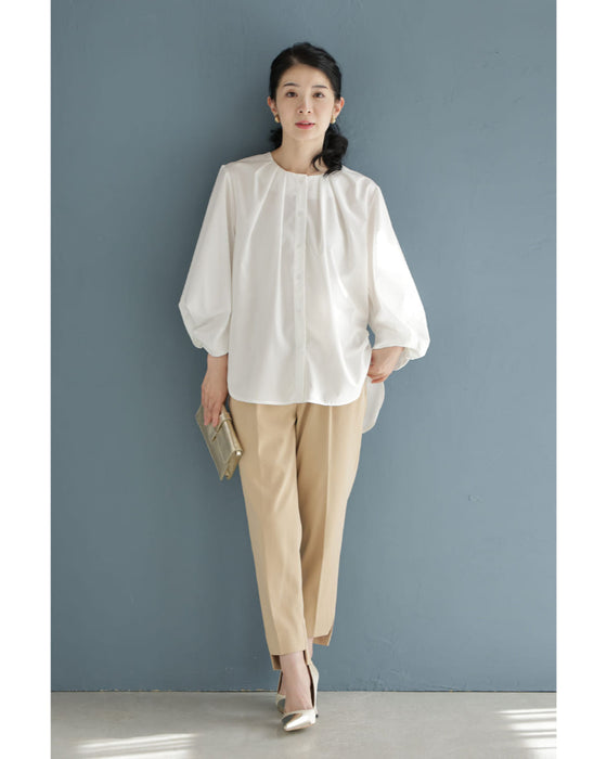 胸元のタックで自然と縦ラインを強調。体型カバーも叶えるデザインで着るだけで華やぐ、大人フェミニンなブラウス。
