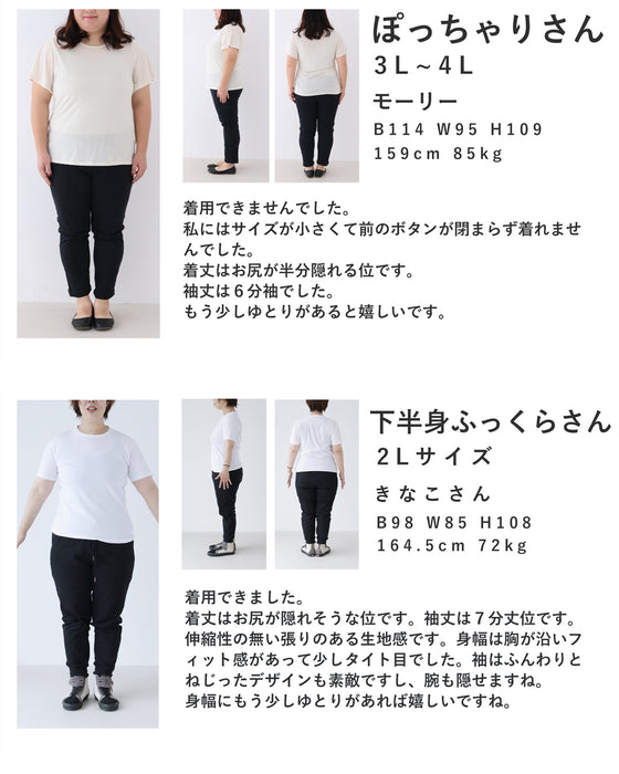 | Size | 肩幅 | 身幅 | 着丈 | 前下がり | 袖丈 | アームホール | 袖口 |